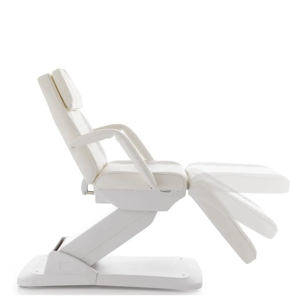 Questo lettino elettrico presenta 2 snodi che dividono seduta, schienale e gambali che risultano comodissimi grazie alla loro imbottitura in poliuretano schiumato e il rivestimento in skai ecopelle di colore bianco. Sono presenti anche dei braccioli che si estendono con l'inclinazione dello schienale, ma all'occorrenza possono essere anche rimossi per favorire la comodità del cliente in posizione distesa.