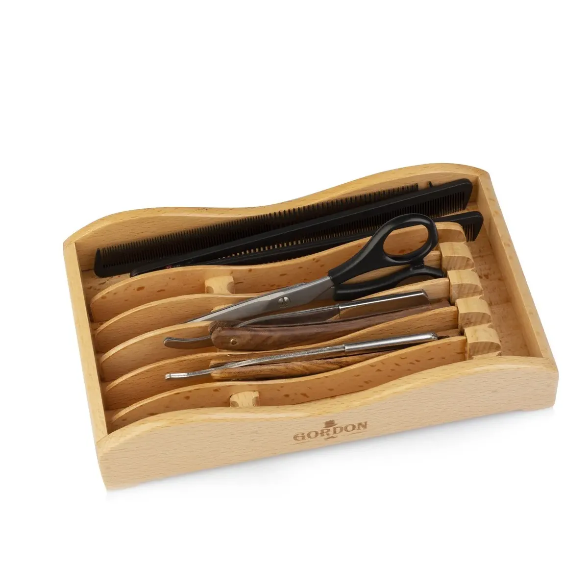 Design ergonomico: La forma curva e le scanalature appositamente progettate consentono di posizionare in modo sicuro forbici, rasoi e pettini di diverse dimensioni. Ogni strumento trova il suo posto ideale, evitando danni e garantendo un facile accesso.
