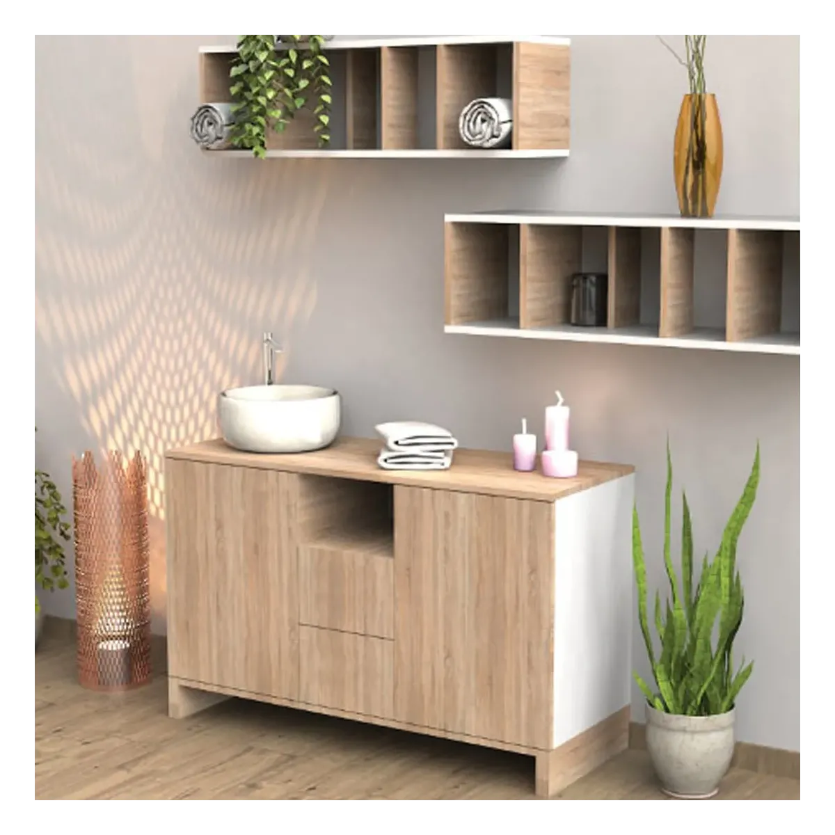 - 2 Espositori a parete: Espositore a parete realizzato in legno rovere e bianco opaco, con mensole separatorie. Dimensioni: Altezza 30 x Lunghezza 90 x Profondità 30 cm.