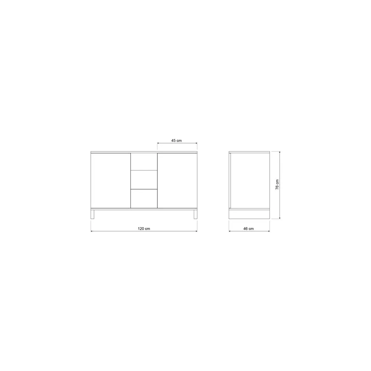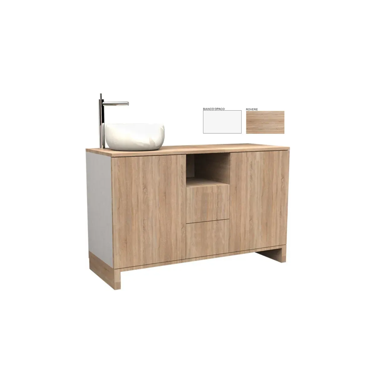 - 1 Mobile di servizio: Mobile di servizio completo di lavello e miscelatore, con 2 ante con sistema di apertura premi/apri, 2 cassetti e un vano a giorno. Dimensioni: Altezza 76 x Lunghezza 120 x Profondità 46 cm.