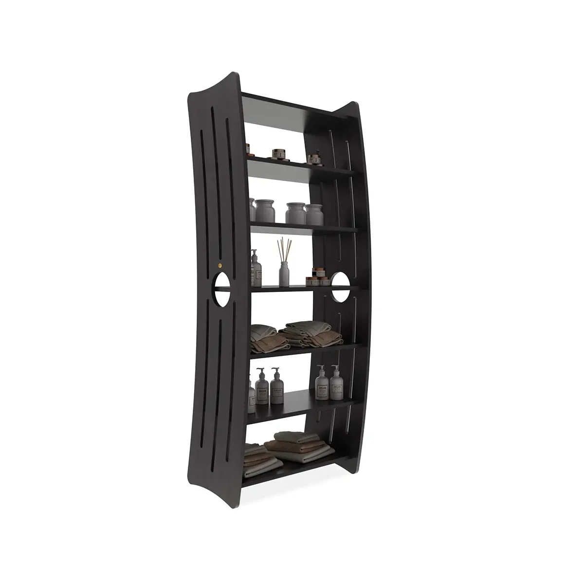 Accompagnato dal lettino, troviamo un pratico espositore a più ripiani, ideale per organizzare in modo ordinato oli essenziali, creme e tutti gli accessori necessari per i trattamenti. La sua presenza non solo aggiunge un tocco di funzionalità, ma contribuisce anche a creare un'atmosfera accogliente e professionale.