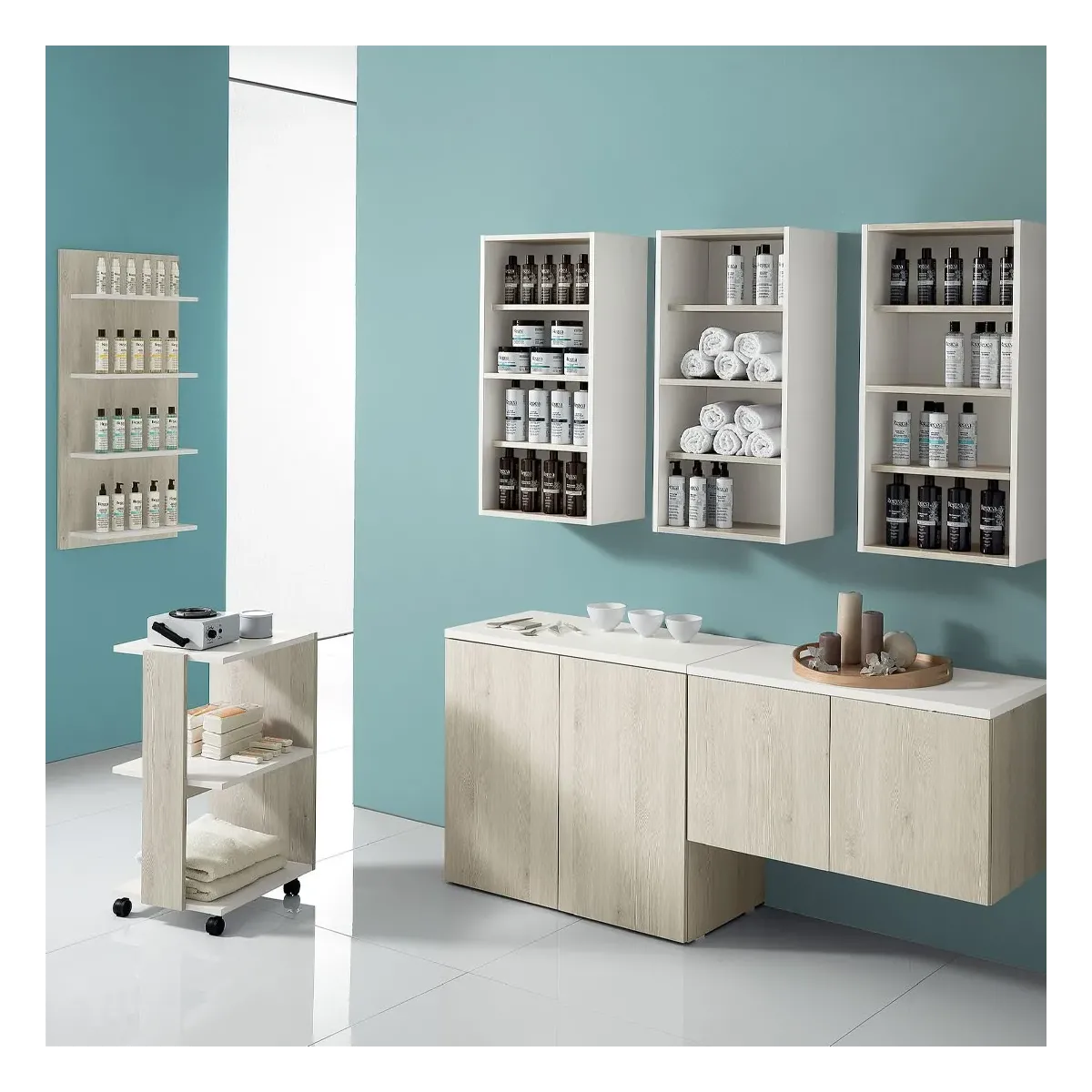 Arredamento Centro Estetico e Spa completo di tutti i complementi di cui hai bisogno, proponiamo in quest'ambientazione completamente in legno Made in Italy con un angolo espositivo dove potrai mostrare ai tuoi clienti i prodotti che andrai ad utilizzare nei vari trattamenti, oppure semplicemente potresti adibirlo come una zona in cui depositare le tue attrezzature da lavoro.