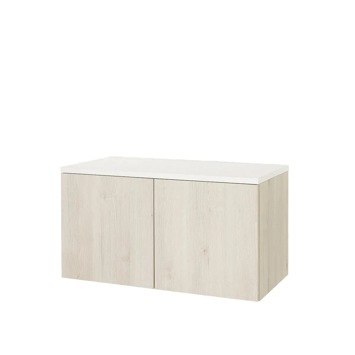 Mobile Centro Estetico montato a parete con struttura realizzata in 2 combinazioni di legno: l'esterno, incluse le ante in legno larice naturale, mentre il ripiano superiore ed il pannello sul retro in legno laminato di colore bianco.