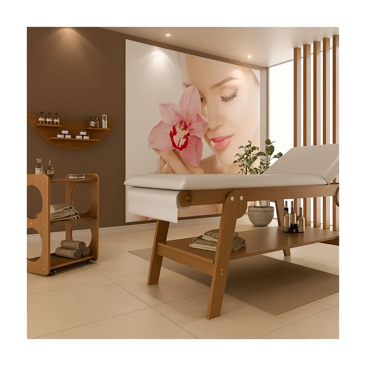 Al centro della scena troviamo il lettino, un capolavoro di ergonomia e comfort. La sua struttura in legno massello, disponibile in diverse tonalità calde e naturali, si adatta a qualsiasi stile d'arredo, conferendo all'ambiente un tocco di raffinatezza senza tempo. Il rivestimento morbido e imbottito, realizzato con materiali anallergici, garantisce ai tuoi clienti un'esperienza di trattamento unica e rilassante. La regolazione elettrica dell'altezza e dell'inclinazione dello schienale permette di personalizzare la posizione in base alle diverse esigenze, assicurando il massimo comfort durante i trattamenti.