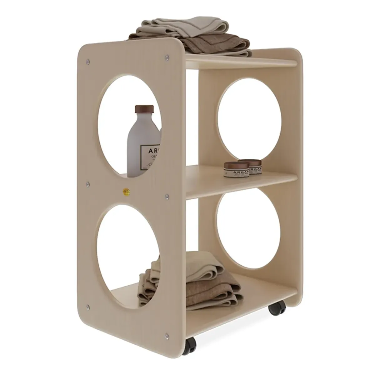 Il carrello estetica è realizzato in Legno Multistrato di Betulla, per la cui verniciatura sono utilizzate vernici naturali e atossiche che rispettano l’equilibrio naturale del legno e l'ambiente. Il carrello è stato progettato e realizzato immaginando un prodotto essenziale ed adeguato a qualsiasi utilizzo, maneggevole e comodo, capace di donare caratteristiche di funzionalità al design del contesto in cui è collocato. Dotato di tre ripiani, è un prodotto impiegato sia come portaoggetti che per l'esposizione di prodotti.