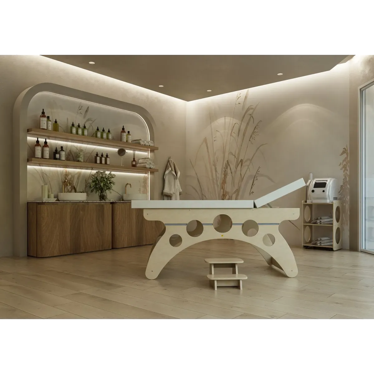 Questo Arredamento Centro Estetico è un complemento d'arredo essenziale per qualsiasi centro estetico o spa che voglia unire funzionalità ed estetica. Realizzato in legno di alta qualità, che si adatta a qualsiasi tipo di ambiente.