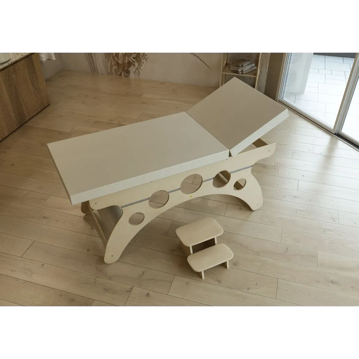 I fori circolari sulla struttura non sono solo un elemento estetico, ma contribuiscono anche a rendere il lettino più leggero e arioso. Inoltre, permettono una migliore circolazione dell'aria, garantendo il massimo comfort al tuo cliente durante i trattamenti.