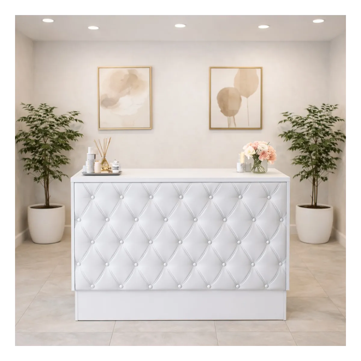 Questo splendido banco reception negozio con struttura Bianco con Pannello Trapuntato in ecopelle è un'aggiunta raffinata per qualsiasi ambiente da lavoro.