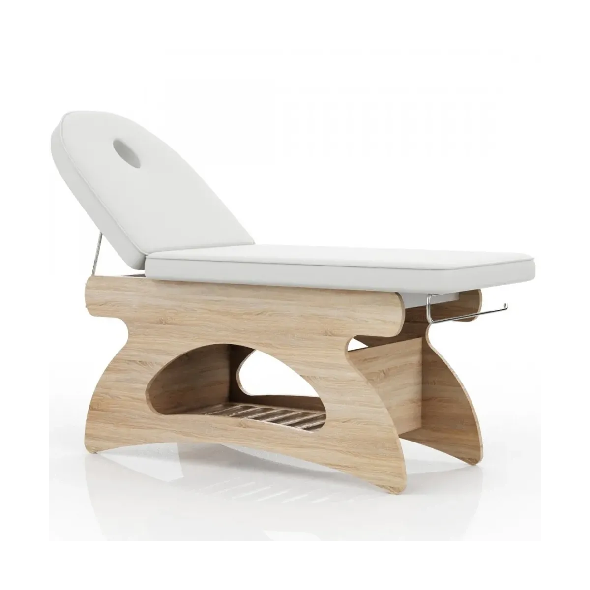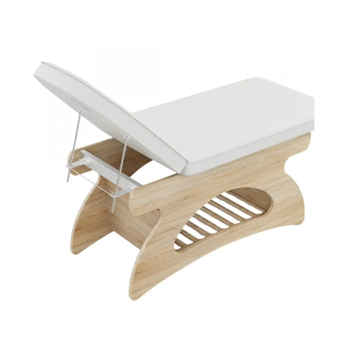 Lettino Massaggio in legno di colore bianco e rovere con linee di design molto moderne e particolari by Melcap, caratterizzate da una struttura molto stabile che sorregge un materasso diviso in 2 sezioni tramite snodo grazie al quale è possibile inclinare lo schienale.