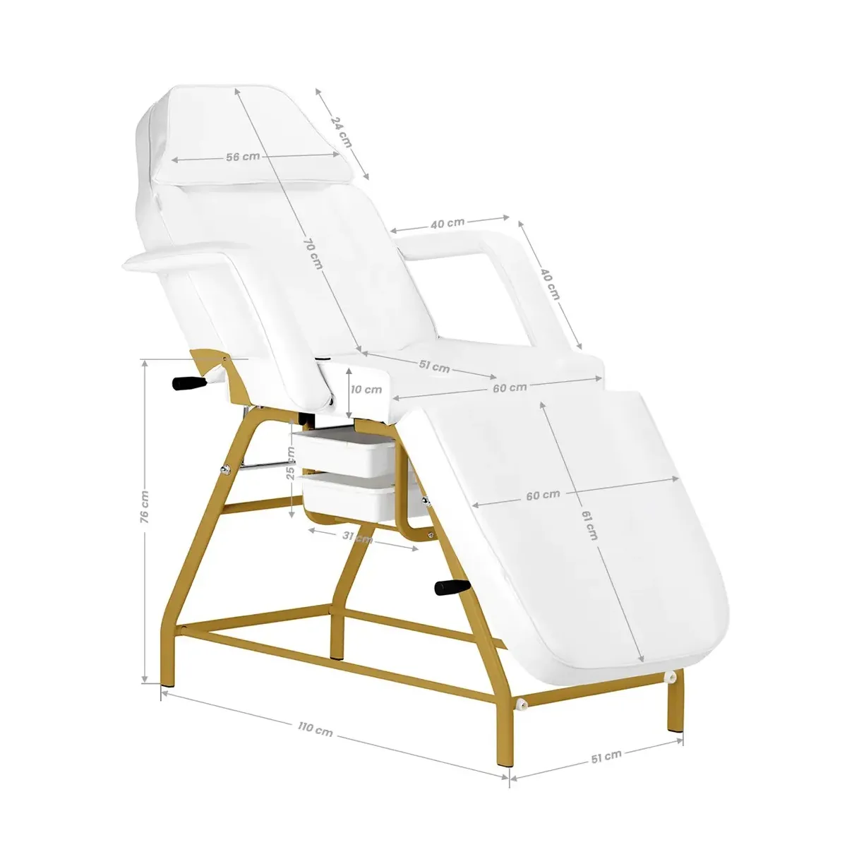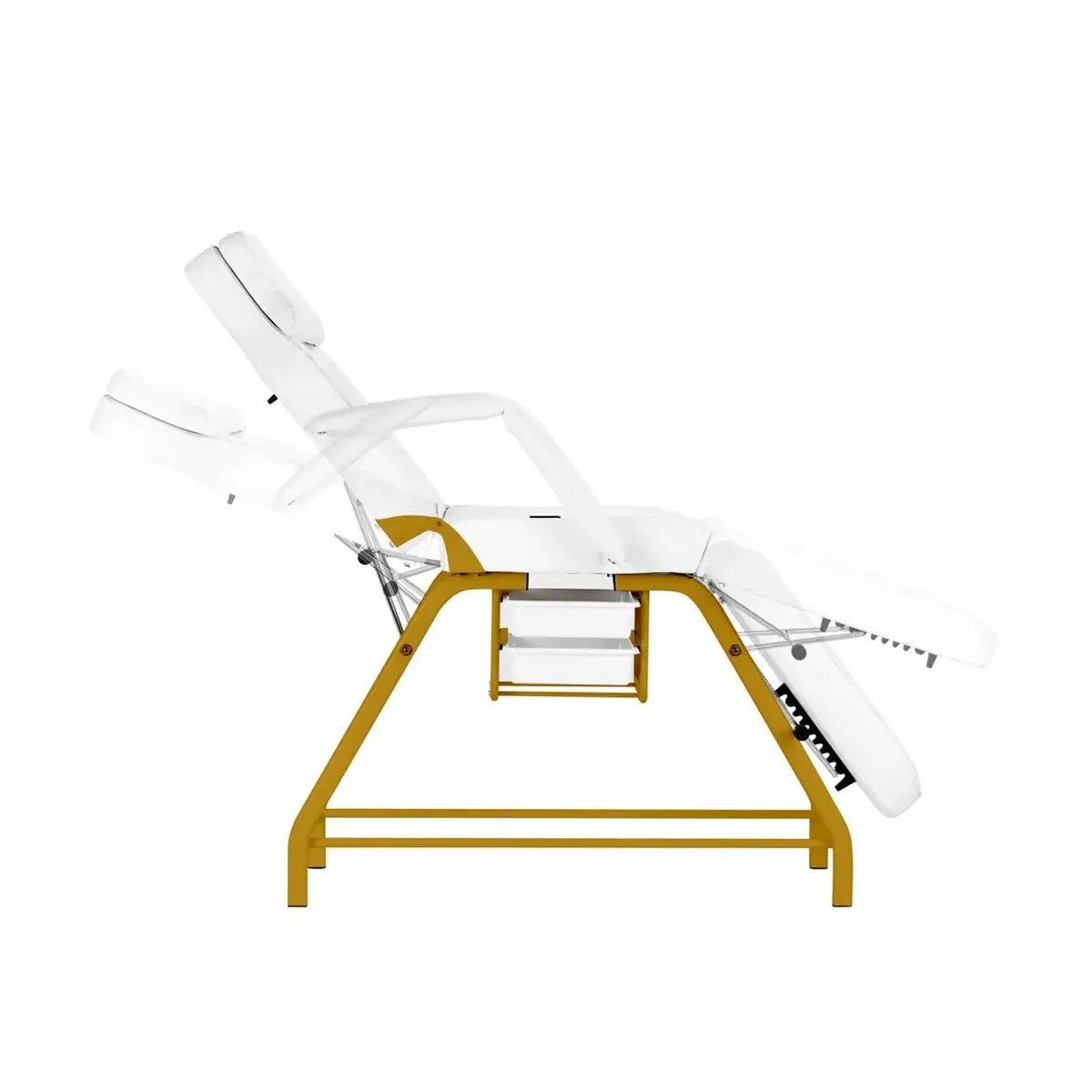 Il design moderno, caratterizzato dalla struttura color oro e dal rivestimento bianco, valorizza l’ambiente professionale trasmettendo un’immagine curata, raffinata e di alta qualità. L’offerta include lettino professionale e carrello coordinato, ideali per organizzare al meglio la cabina di lavoro e migliorare l’esperienza del cliente.