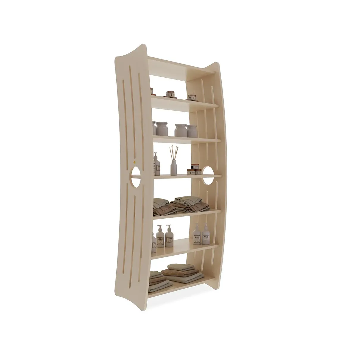 Questo raffinato espositore in legno è la soluzione ideale per organizzare e valorizzare la tua collezione di prodotti e cosmetici. Con i suoi 7 ripiani, offre ampio spazio per esporre in modo ordinato e accattivante ogni articolo.
