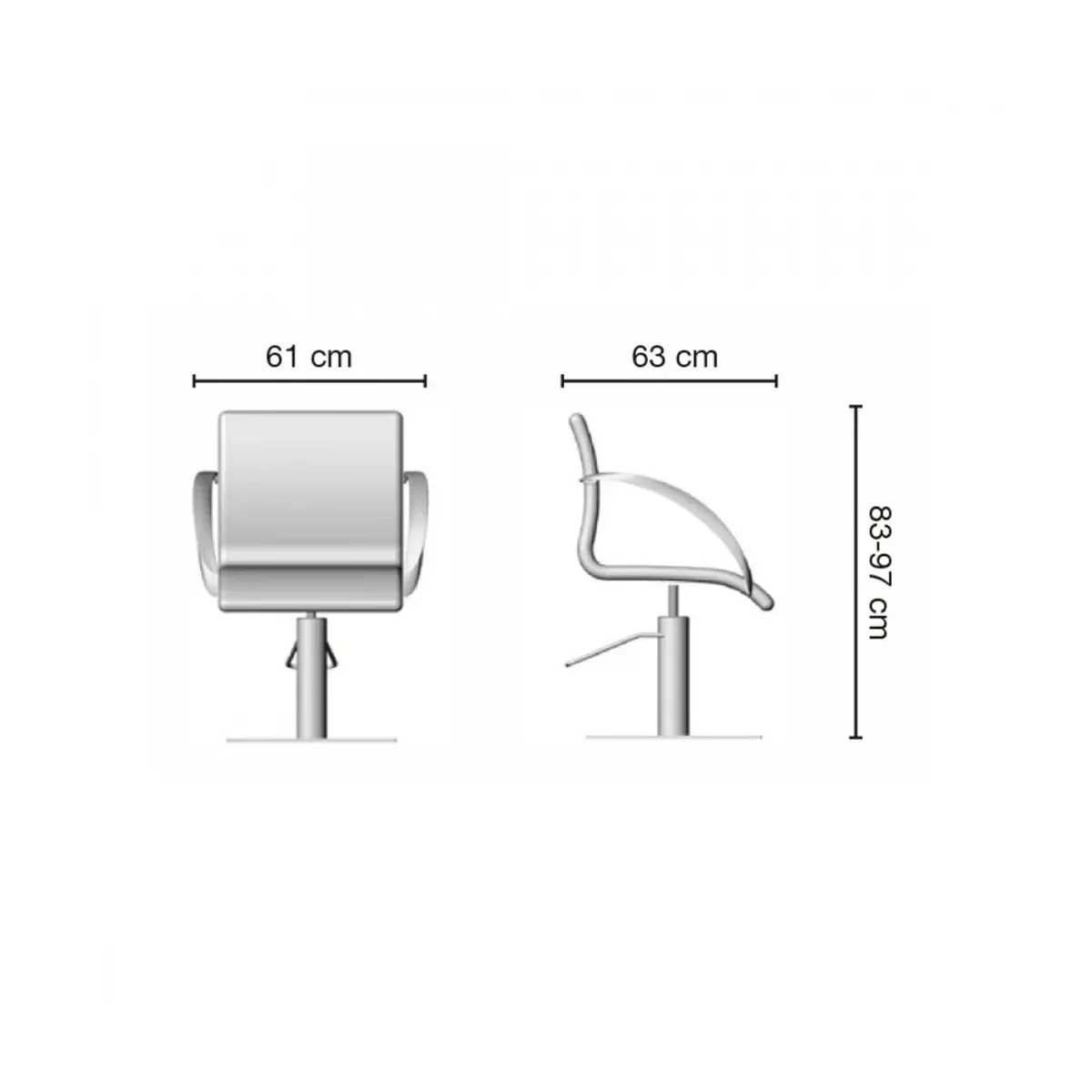 Le poltrone parrucchiere Siena a base girevole hanno una seduta con braccioli realizzata in poliuretano schiumato con inserti in legno multistrato, la profondità è di 63 centimetri e la larghezza di 61 centimetri. Il tutto rivestito in skai con colori a scelta personalizzabili da scegliere tra le immagini presenti nell'arredamento parrucchiere online. La struttura sulla quale appoggia è una solida lega in acciaio inox con pompa idraulica a freno che permette di regolare l'altezza della seduta dagli 83 ai 97 centimetri, infine appoggia su di una solida base a 5 razze.