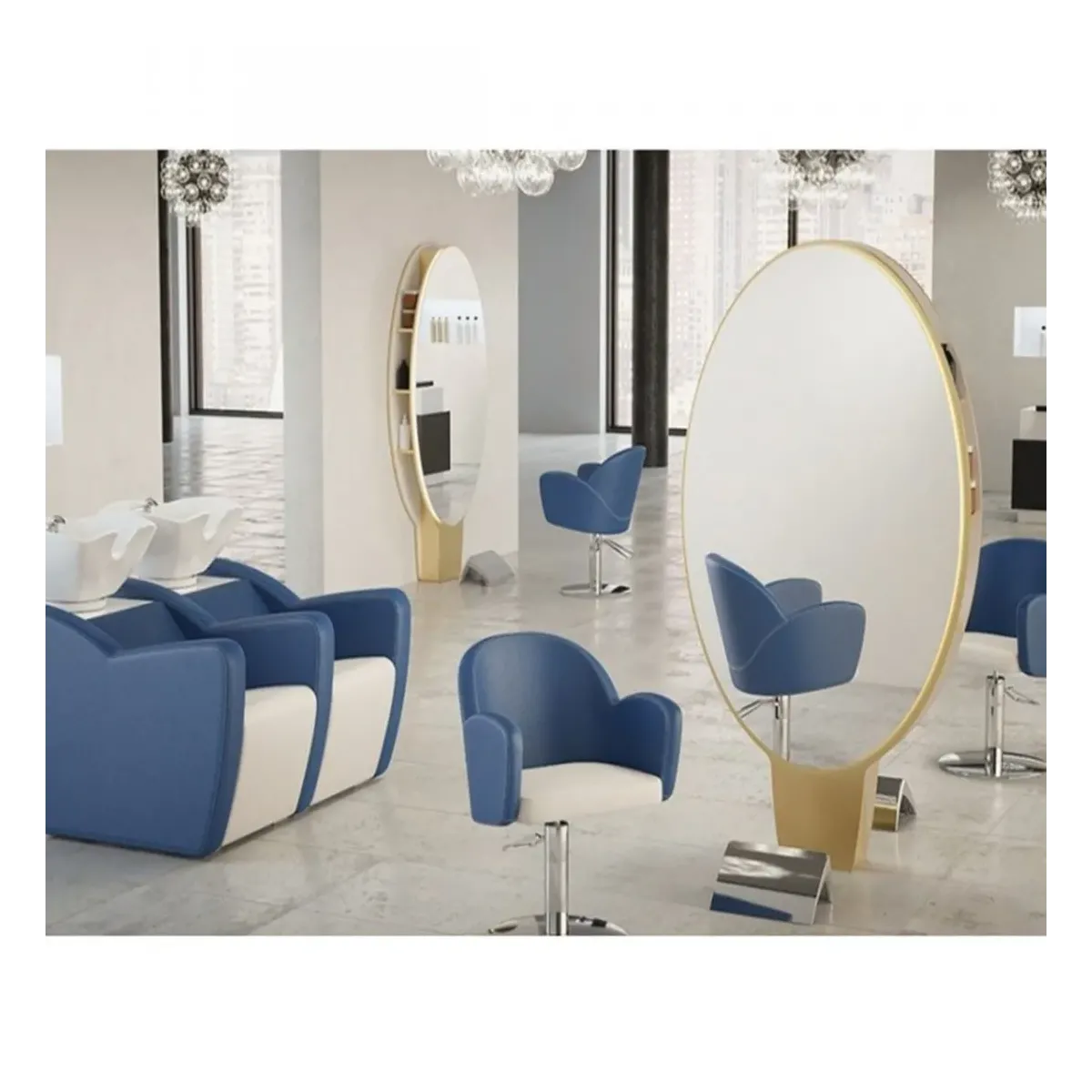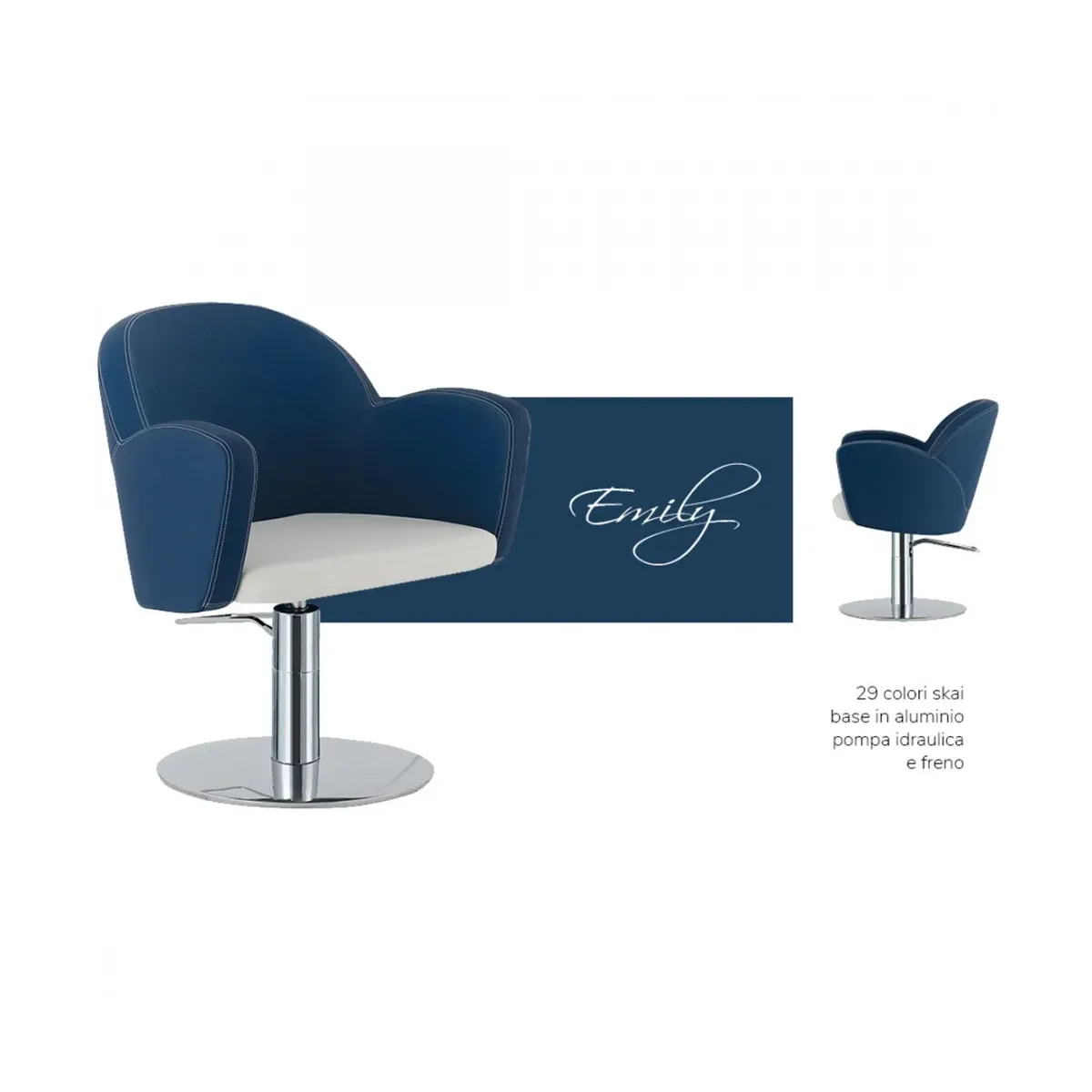 L'arredo comprende 3 poltrone per parrucchieri della linea Emily dal design moderno e confortevole, molto vivaci e belle da vedere con i colori da noi proposti di colore blu e bianco, anche qui con possibile personalizzazione attraverso le diverse colorazioni presenti nel campionario Skai dell'arredamento parrucchiere online.