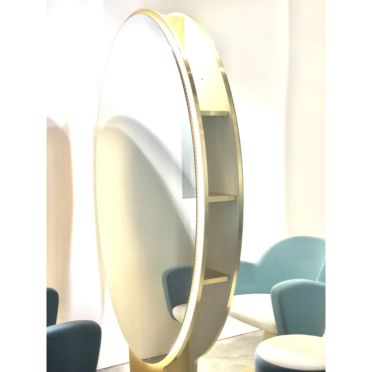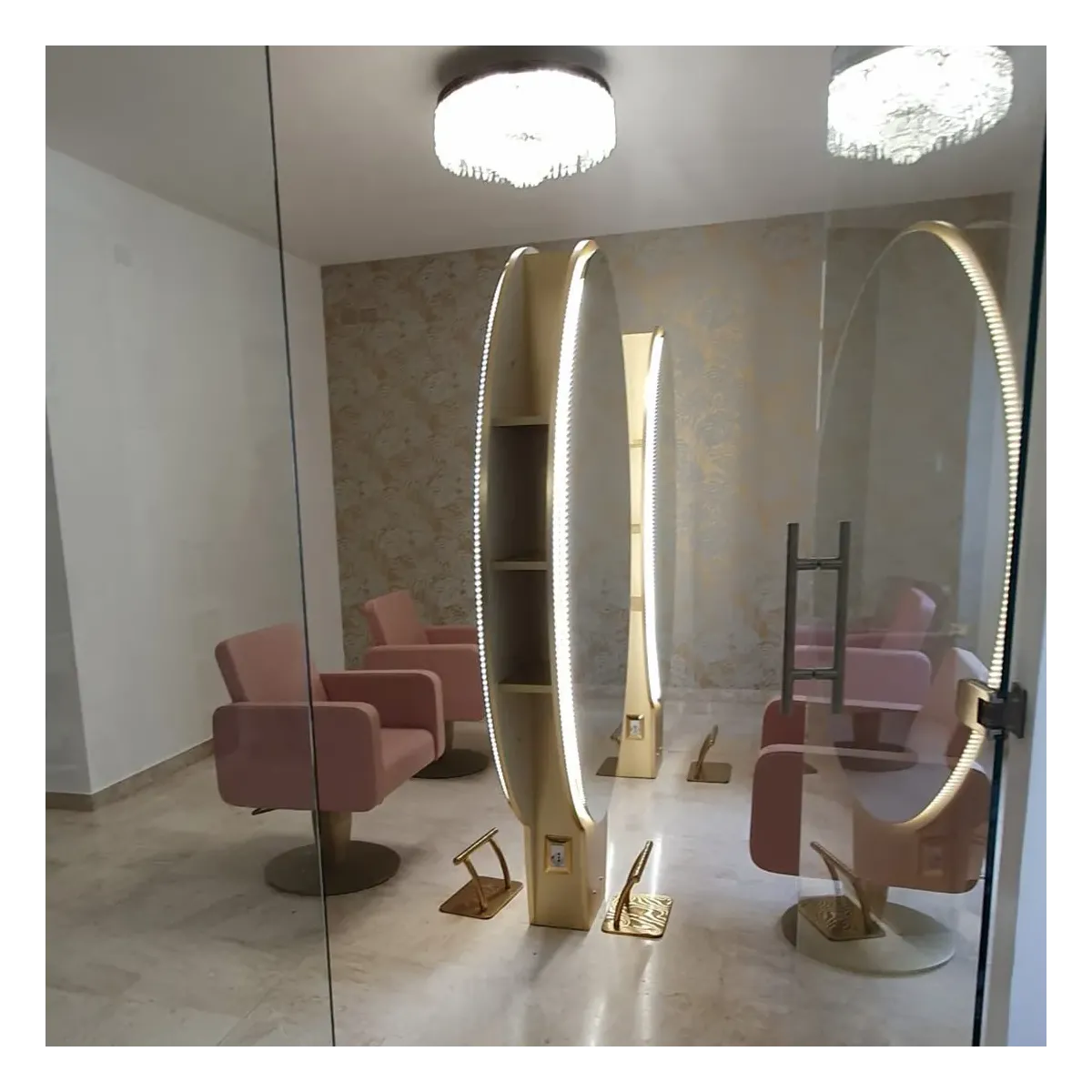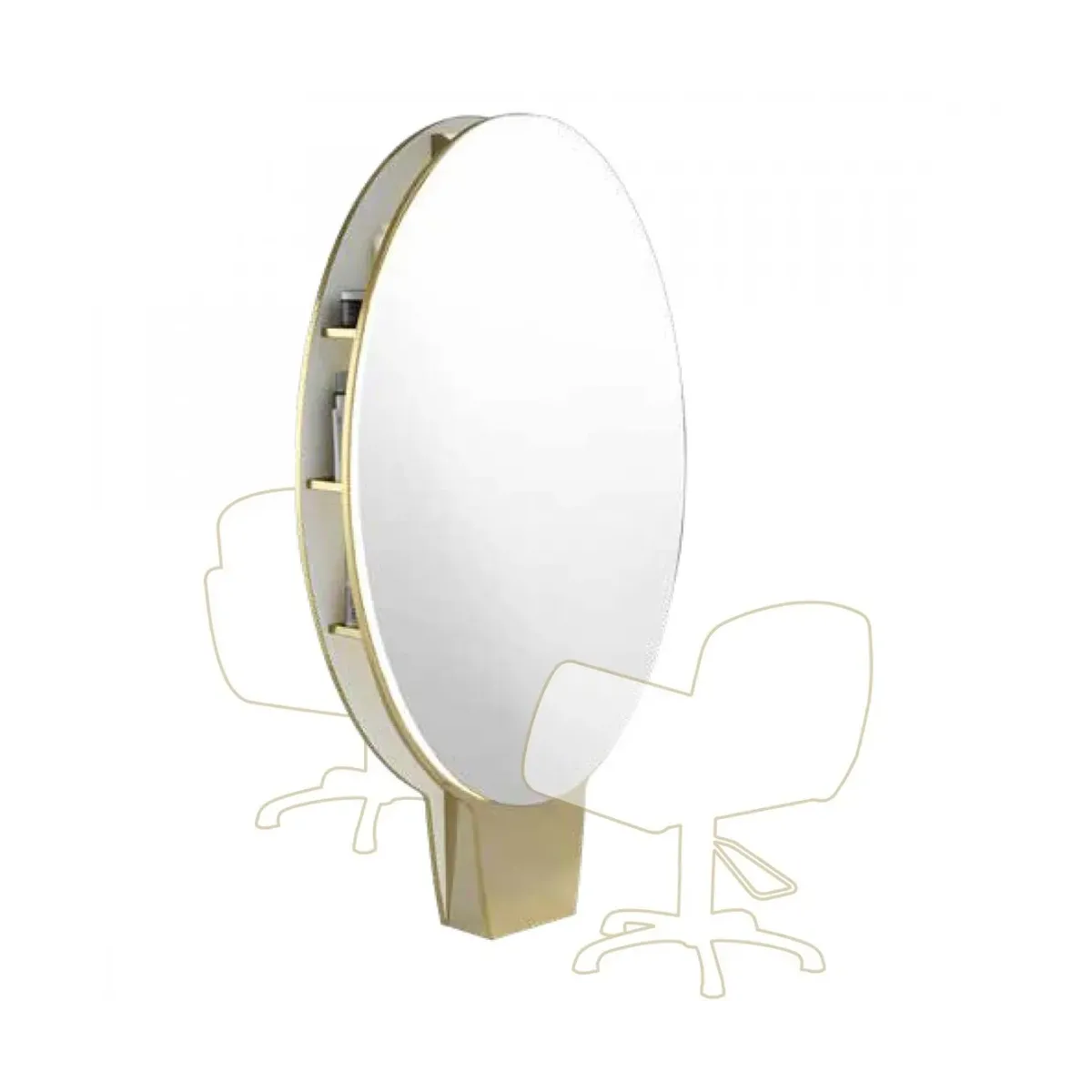 La struttura degli specchi è composta in legno nobilitato di colore oro, con specchio ovale incollato ambo i lati caratterizzato da una cornice luminosa con led, questo dettaglio sarà fondamentale per far risaltare i dettagli dei capelli e aiutarti nell'eseguire dei lavori impeccabili.