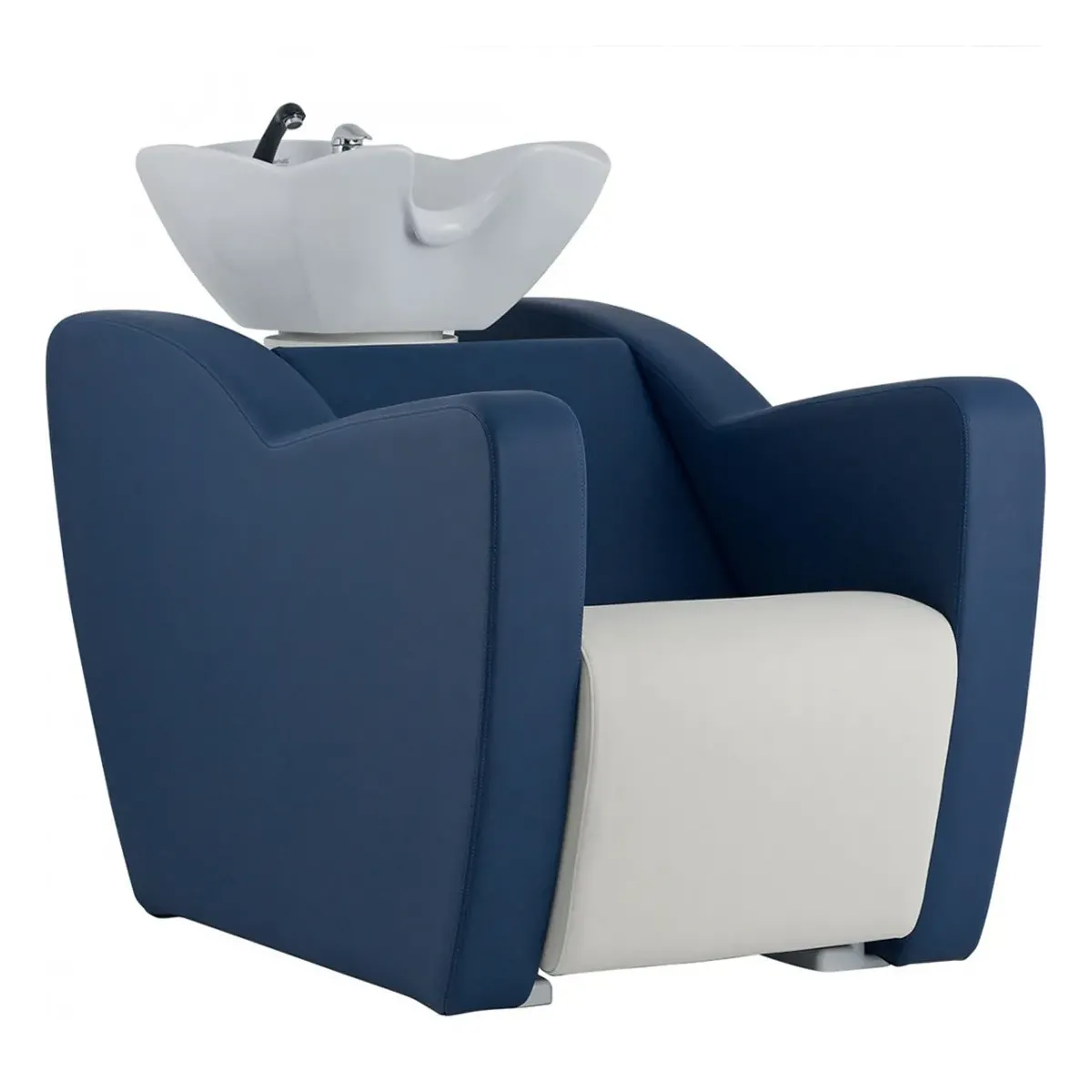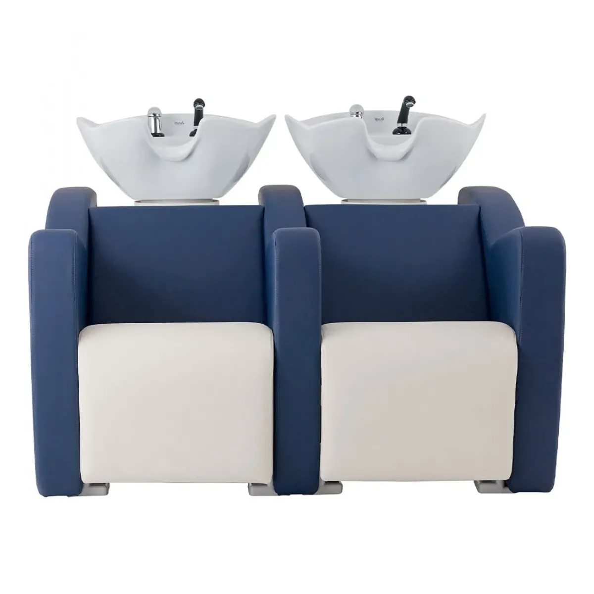 I 2 lavaggi per parrucchieri sono realizzati con fantastici inserti in legno e metallo, seduta e schienale in poliuretano schiumato con rivestimento skai di colore blu in contrasto con il bianco della seduta, è possibile anche personalizzarlo in vari colori presenti nel campionario Skai.