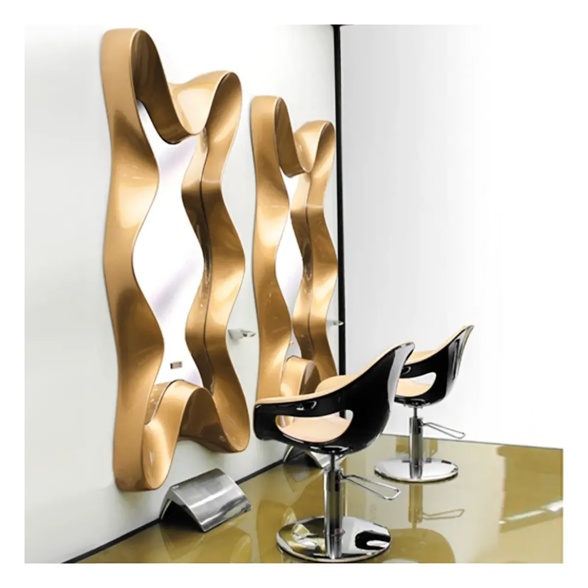 La loro struttura è realizzata in foglia polimerica con specchio incollato, mentre la cornice dalla fantasia ondeggiante è fatta in vetroresina proposta in colorazione oro, ma che può essere anche richiesta bianca e nera, inoltre è possibile richiedere l'illuminazione a led che verrà installata lungo i bordi dello specchio facendo risaltare molti dettagli molto utili in salone. Il montaggio degli specchi viene effettuato a parete occupando pochissimo spazio.