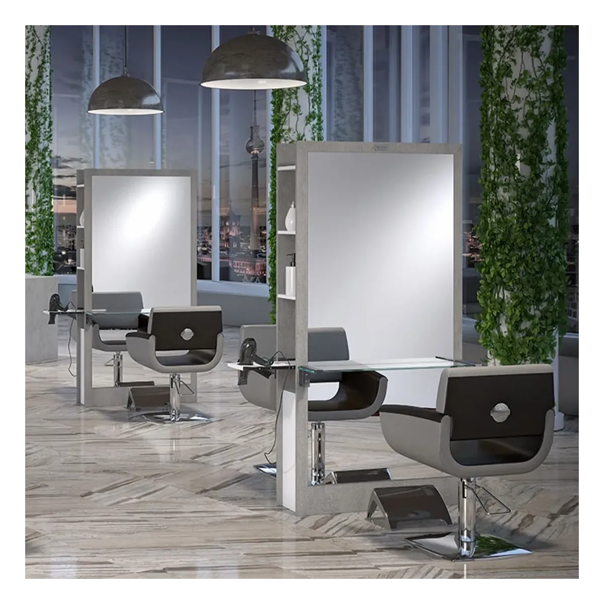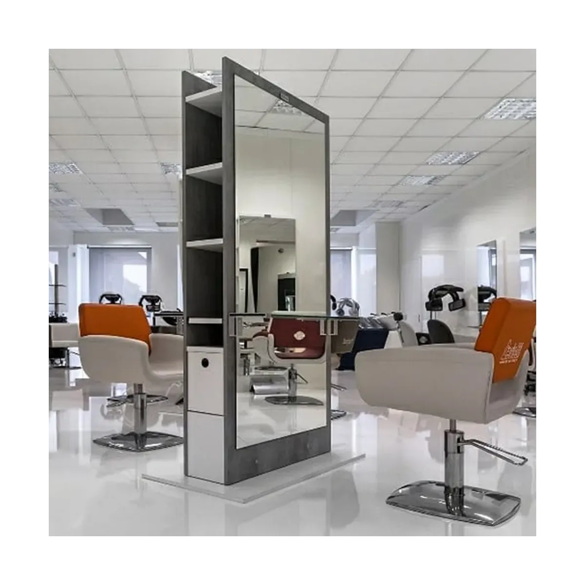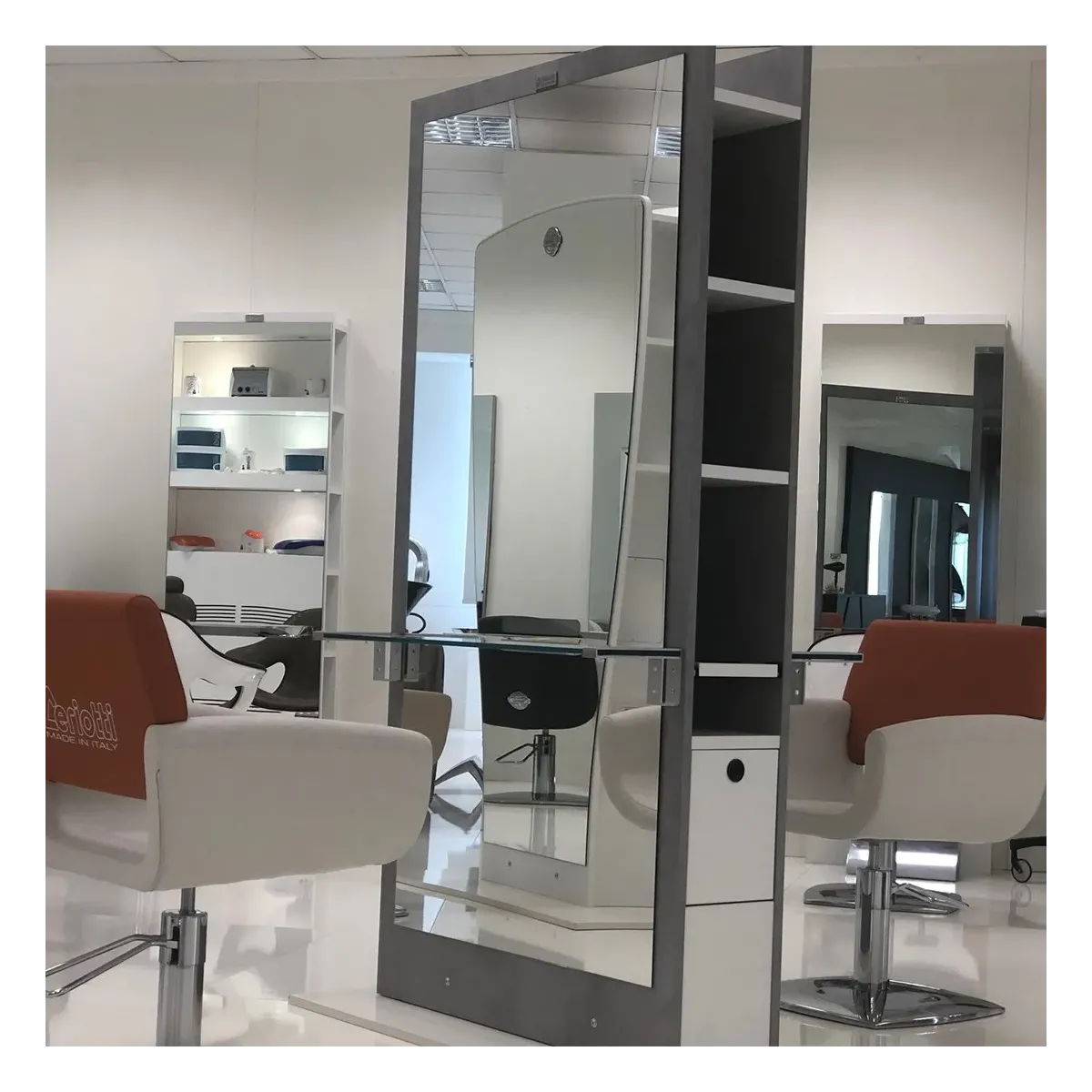 Lo specchio per parrucchiere State-S è caratterizzato da una doppia postazione la cui struttura è realizzata in legno nobilitato con finiture a scelta tra quelle in foto.