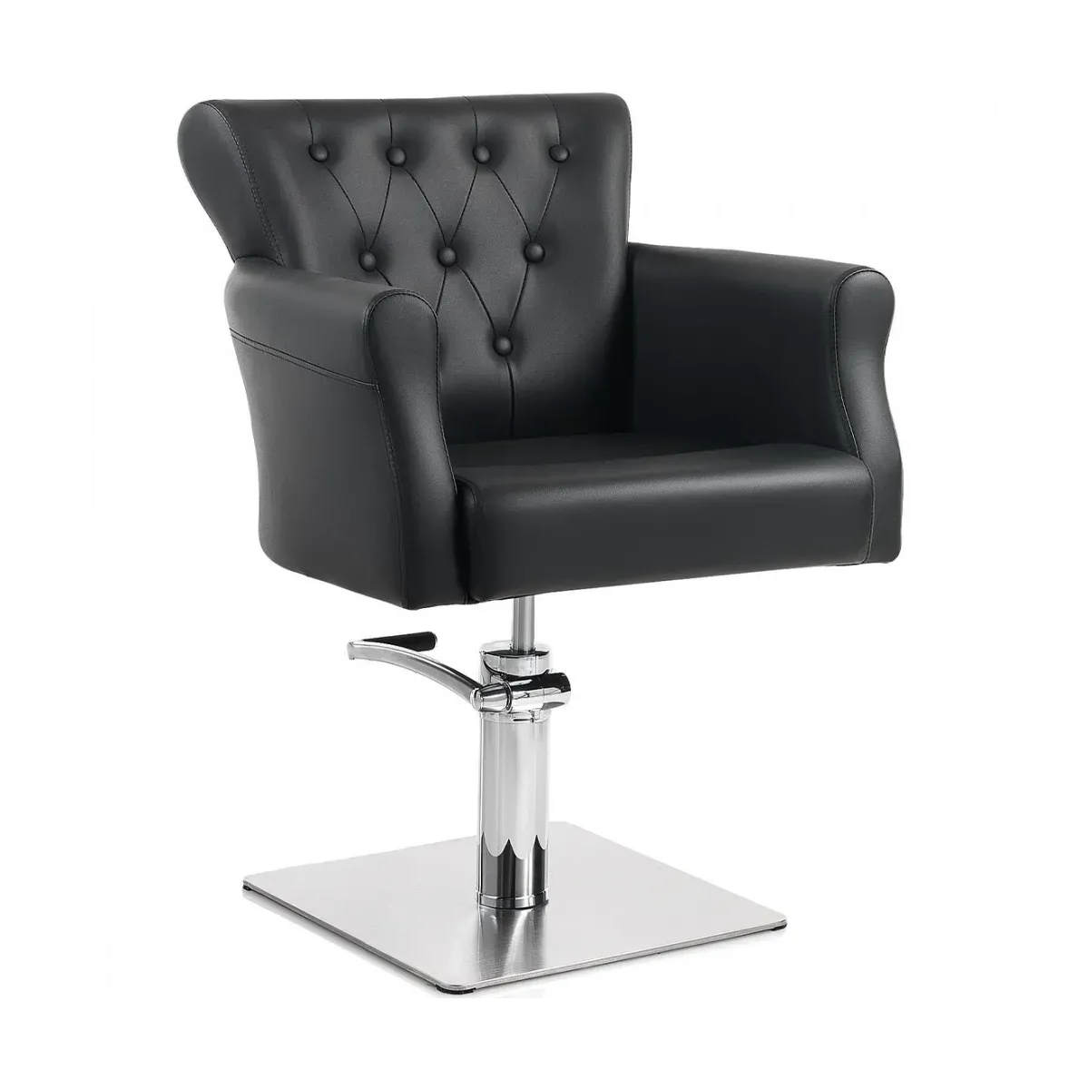 Poltrone parrucchieri dal design un po' vintage che richiamano la figura di un trono, ideale per far sentire a proprio agio il cliente, anche perché particolarmente comode. La seduta e lo schienale sono infatti imbottite ad alta densità e sono poi rivestite in skai ecopelle di colore nero. La sedia parrucchiere dispone anche di una struttura in alluminio che comprende la base quadrata insieme al sistema di pompa idraulica e freno, molto utile per regolare l'altezza della seduta ed evitare degli inutili sforzi con la schiena.