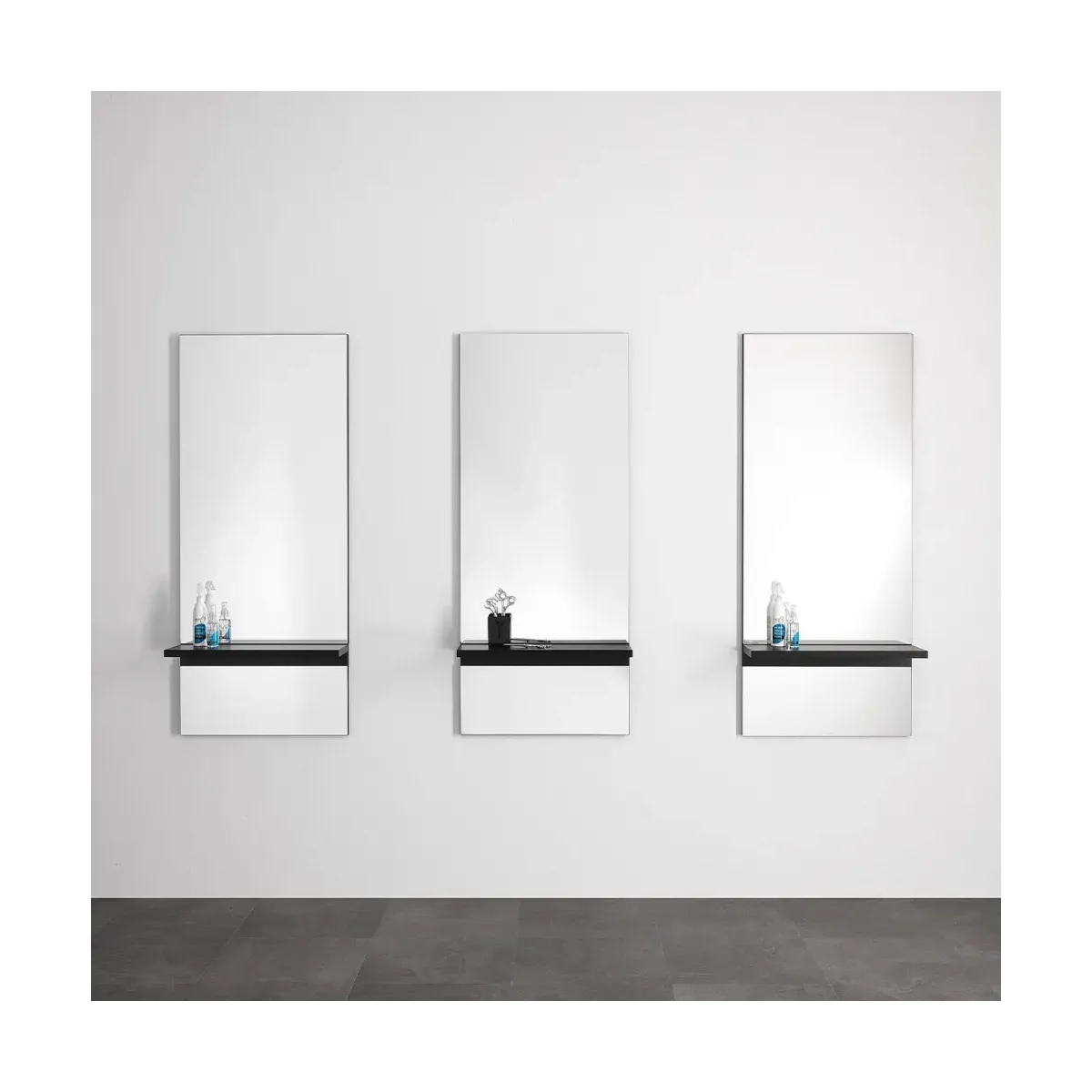 Specchi per parrucchieri a parete con intera superfice riflettente, questo particolare non è da sottovalutare in quanto rende il salone più grande alla vista dei tuoi clienti. Ogni specchio parrucchiere è dotato di una mensola per riporre gli oggetti personali della cliente oppure gli attrezzi da lavoro.