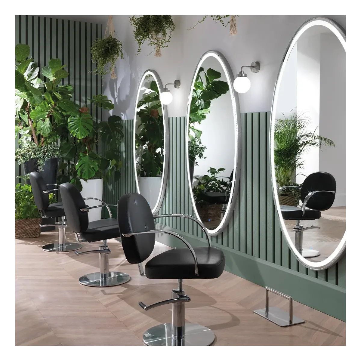 Arredo Negozio Parrucchiere con 3 Specchi Ovali a Led e 3 Poltrone