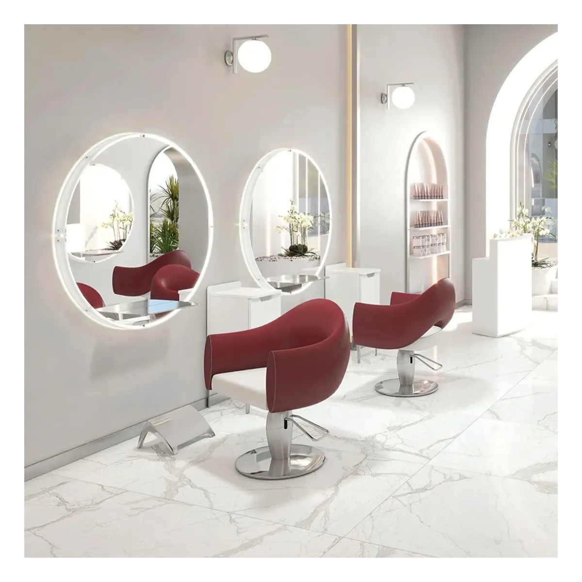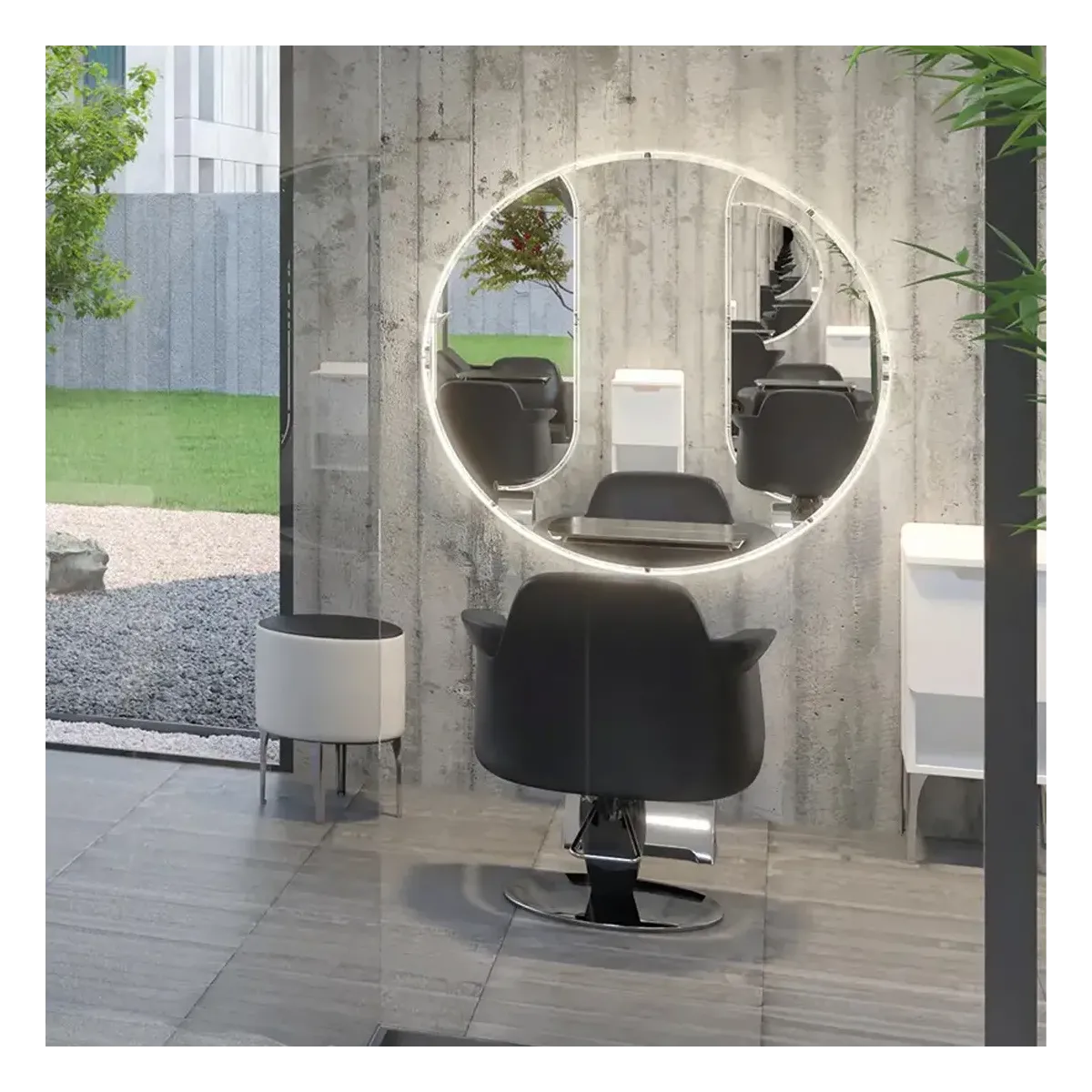 Gli specchi parrucchieri Oblò Luxury hanno una forma tonda priva di cornice, infatti l'effetto di quando i clienti vi si posizionano di fronte è proprio quello di affacciarsi da un oblò, i contorni sono fatti in ABS cromato per dare l'effetto alluminio ed hanno un sistema di retroilluminazione a Led che renderà molto bello e caratteristico l'effetto riflettendo sulla parete, inoltre sono dotati di una una comoda mensola in acciaio per riporre attrezzature oppure gli oggetti personali delle clienti.