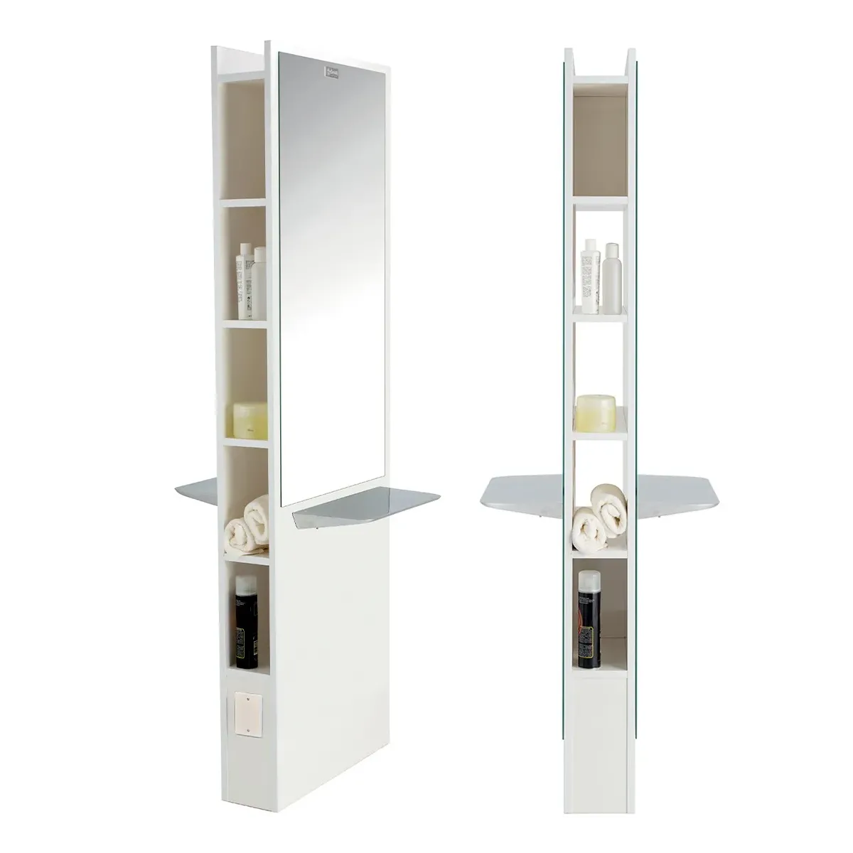 Questi Specchi parrucchiere Venus hanno una struttura in legno nobilitato di colore bianco con 2 specchi incollati ai lati, nel mezzo sono presenti delle mensole molto utili per ospitare prodotti, asciugamani e altre attrezzature, 2 mensole frontali in alluminio pressofuso ed è presente anche la predisposizione elettrica per collegare le prese che potranno servirvi per phon e piastre capelli.