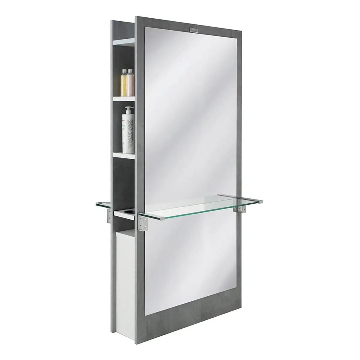 Questi Specchi parrucchiere State S a doppia postazione, con struttura in solido legno nobilitato con finiture a scelta, ripiano per appoggiare oggetti e attrezzi in cristallo, 2 portaphon estraibili, un cassetto e 4 mensole laterali.