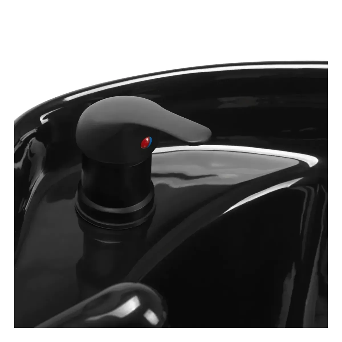Questo lavatesta per parrucchieri è strutturato con la base portante verniciata di colore nero, seduta confort in polipropilene e tappezzata in similpelle sky nero, lavello in ceramica basculante di colore nero e gruppo miscelatore con doccetta inclusi.