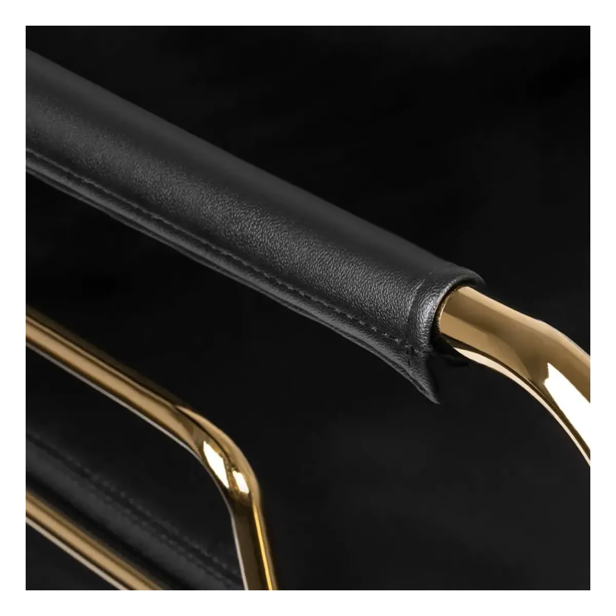 La struttura che mantiene la seduta non è ricoperta dal tessuto, ma è a vista, diventando un elemento decorativo di colore oro che la rende una poltrona innovativa ed elegante che darà un tocco unico al tuo salone.