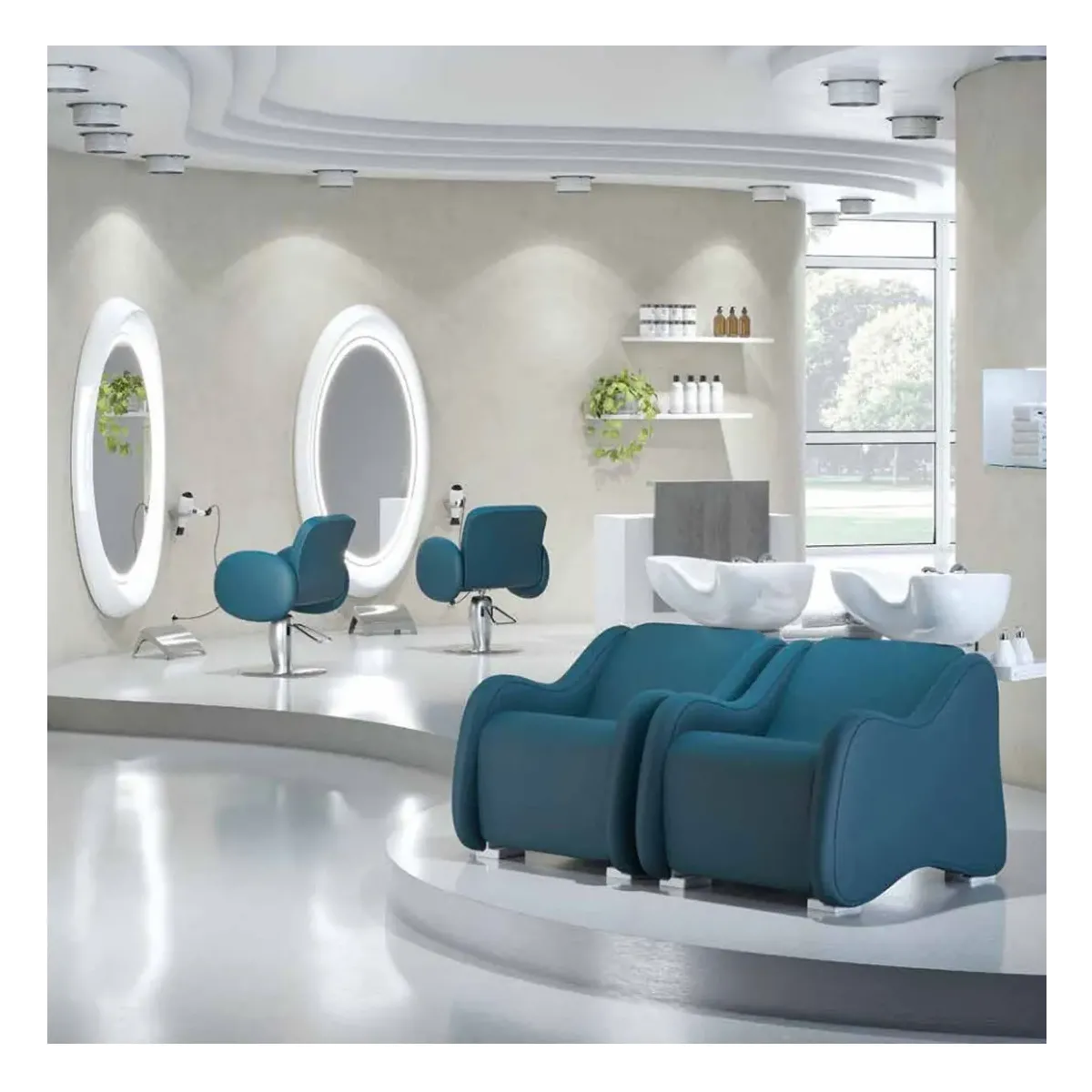 La proposta è per arredamento parrucchieri completo di area taglio e piega e area lavaggio capelli. Vediamo i complementi nel dettaglio.