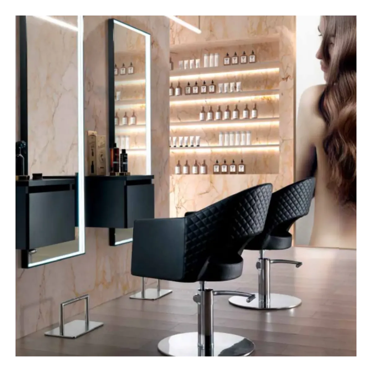 Questo Arredamento Parrucchieri si distingue per un'eleganza moderna e raffinata, caratterizzata da linee pulite e materiali di alta qualità. Le pareti rivestite in marmo chiaro conferiscono luminosità e un tocco di lusso, mentre l'illuminazione a LED integrata negli specchi e nelle mensole crea un'atmosfera accogliente e professionale.