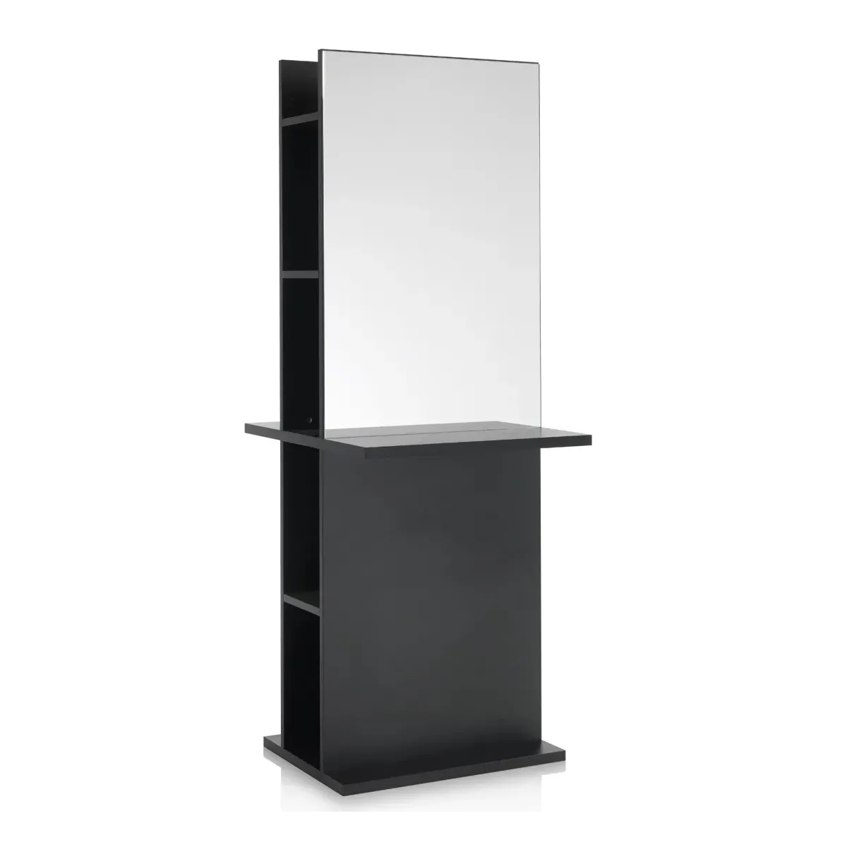 Questi 2 Specchi Doppia Postazione Parrucchiere si distinguonio per il suo design moderno e funzionale. La struttura, in legno nero, è composta da due specchi rettangolari affiancati, ideali per due postazioni di lavoro. Il ripiano centrale, ampio e lineare, offre spazio per appoggiare strumenti e prodotti. Ai lati, due mensole verticali con ripiani aggiuntivi forniscono ulteriore spazio per l'organizzazione. La base, solida e stabile, garantisce sicurezza durante l'utilizzo. Questo specchio è perfetto per saloni di bellezza che desiderano creare un ambiente professionale e ben organizzato, ottimizzando lo spazio e offrendo comfort sia al parrucchiere che al cliente.