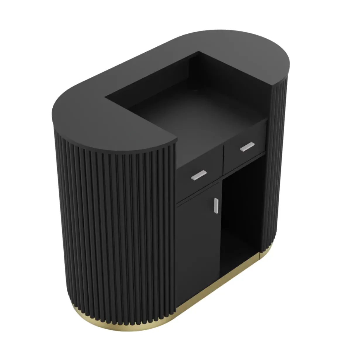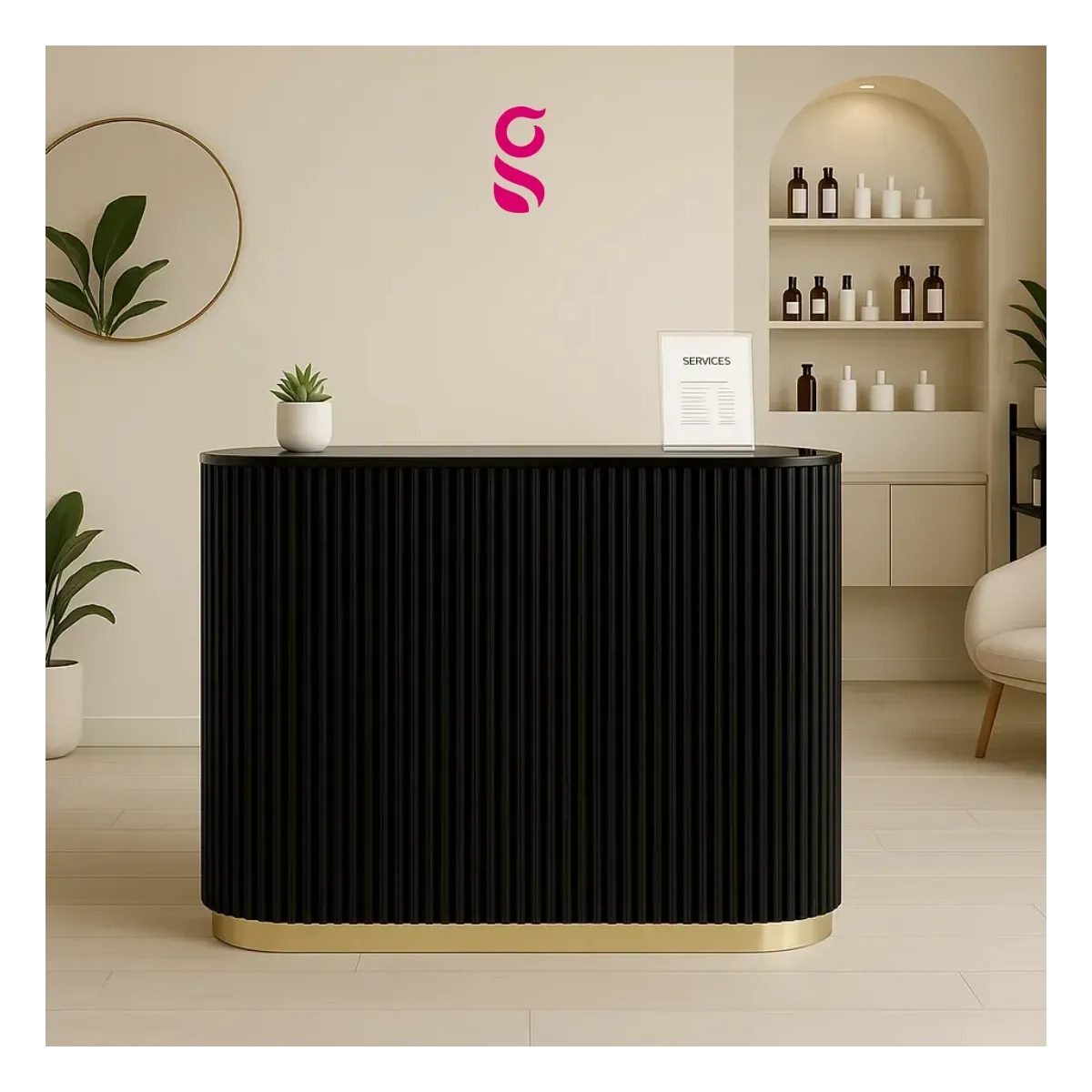 Il Bancone Reception Glamour è la soluzione perfetta per accogliere i tuoi clienti con eleganza e professionalità. Pensato per ambienti di design, questo bancone si distingue per le sue linee morbide e contemporanee, capaci di valorizzare reception, saloni di bellezza, centri estetici, spa, boutique, studi professionali e showroom. La sua struttura è caratterizzata da una superficie liscia e raffinata, accompagnata da un frontale con effetto scanalato verticale, che aggiunge profondità e dinamismo al design. La base in finitura oro crea un contrasto lussuoso con il corpo del bancone, conferendo un aspetto esclusivo e ricercato.il bancone Glamour si adatta a diversi stili di arredo, dal moderno minimalista al classico chic. La parte posteriore è funzionale e ben organizzata, offrendo piani di appoggio per registratori di cassa, documenti e strumenti di lavoro. Realizzato con materiali di alta qualità, il bancone garantisce solidità, durata e facilità di manutenzione. È ideale per chi cerca un complemento d’arredo che combini estetica e funzionalità, lasciando una prima impressione impeccabile e memorabile.
