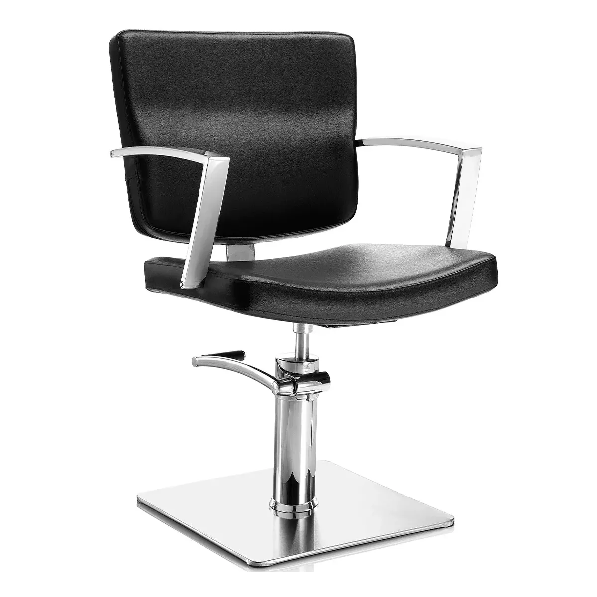 La base della sedia per parrucchiere è in acciaio inox di forma quadrata ed è presente il meccanismo di pompa idraulica e freno che permette di regolare la seduta e quindi di facilitare il lavoro all'hairstylist.