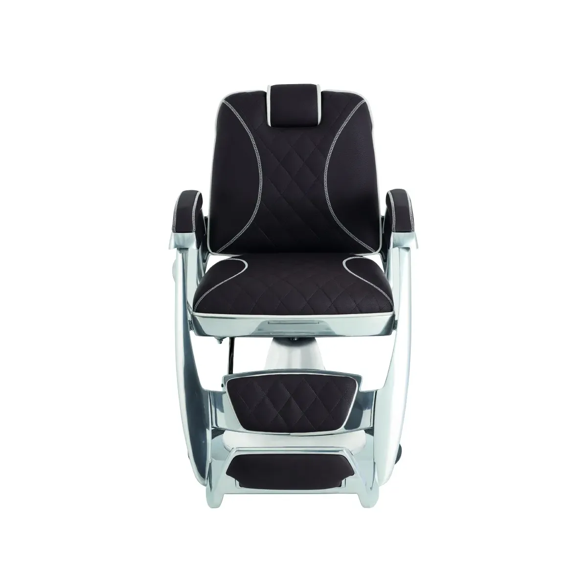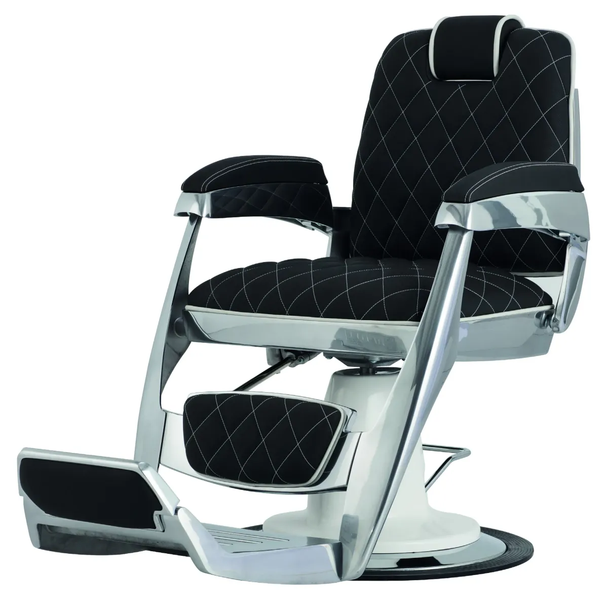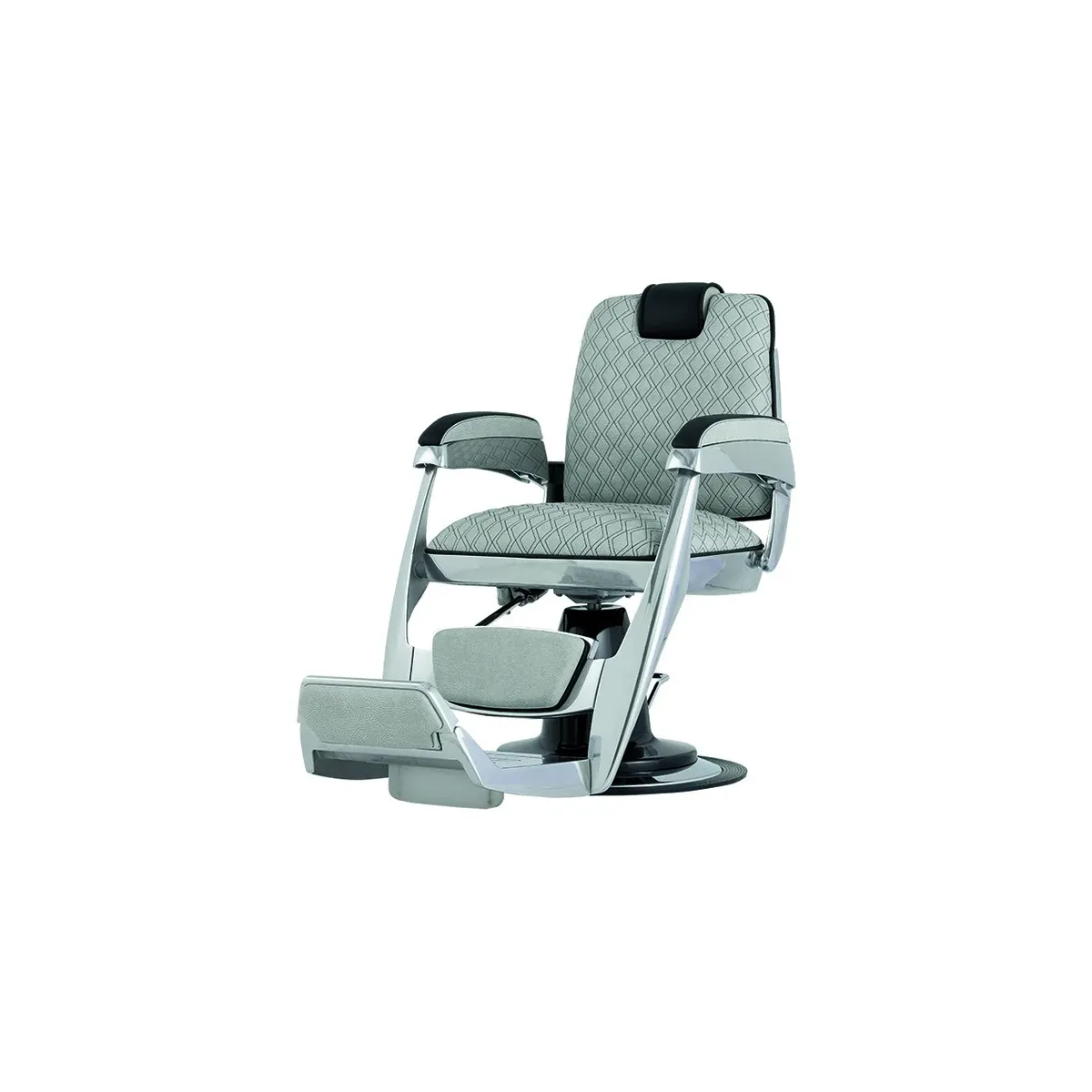 La struttura che sorregge le sedie barbiere è in alluminio e comprende una spaziosa pedana poggiapiedi con poggia gambe e ribalta capace di svolgere la funzione di alzagambe quando la poltrona viene reclinata.