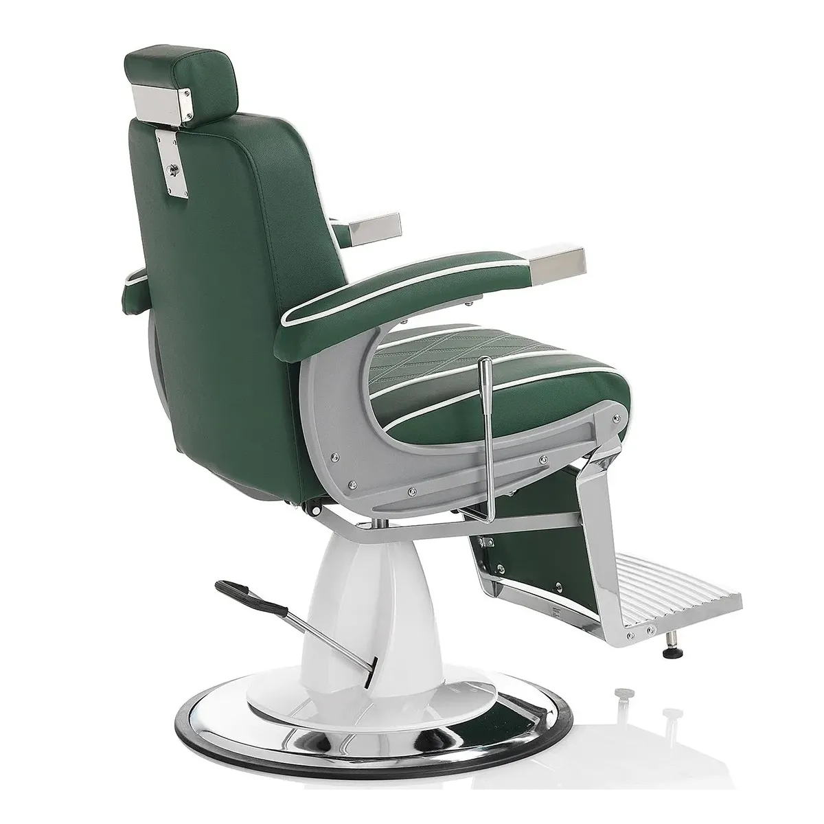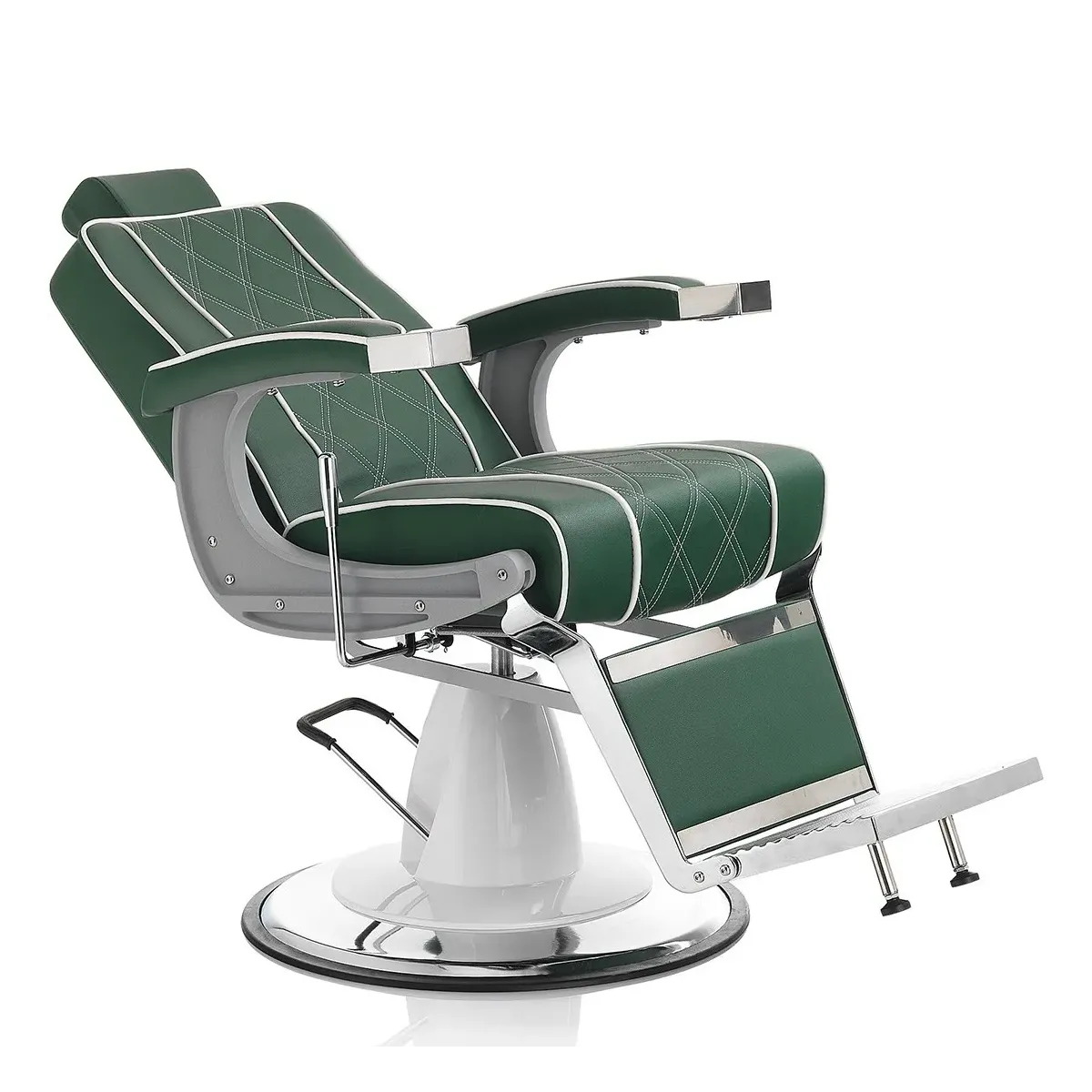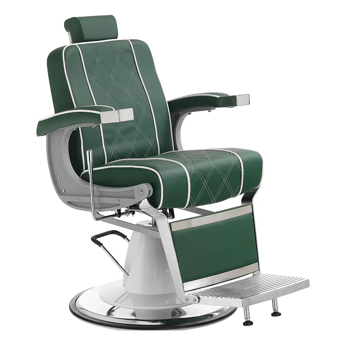 Poltrone Barbiere dallo splendido design che presenta dei ricami sulla seduta e sullo schienale. Struttura solida e stabile in acciaio cromato con base girevole, pompa idraulica e leva per l'inclinazione dello schienale. La sedia barbiere è dotata anche di comodissimi braccioli e poggiatesta regolabile, inoltre scegliendo Hair Granada non rinuncerai nemmeno al confort per i tuoi clienti in quanto è realizzata con un'imbottitura ad alta densità rivestita in skai ecopelle con colore a scelta tra nero e verde.