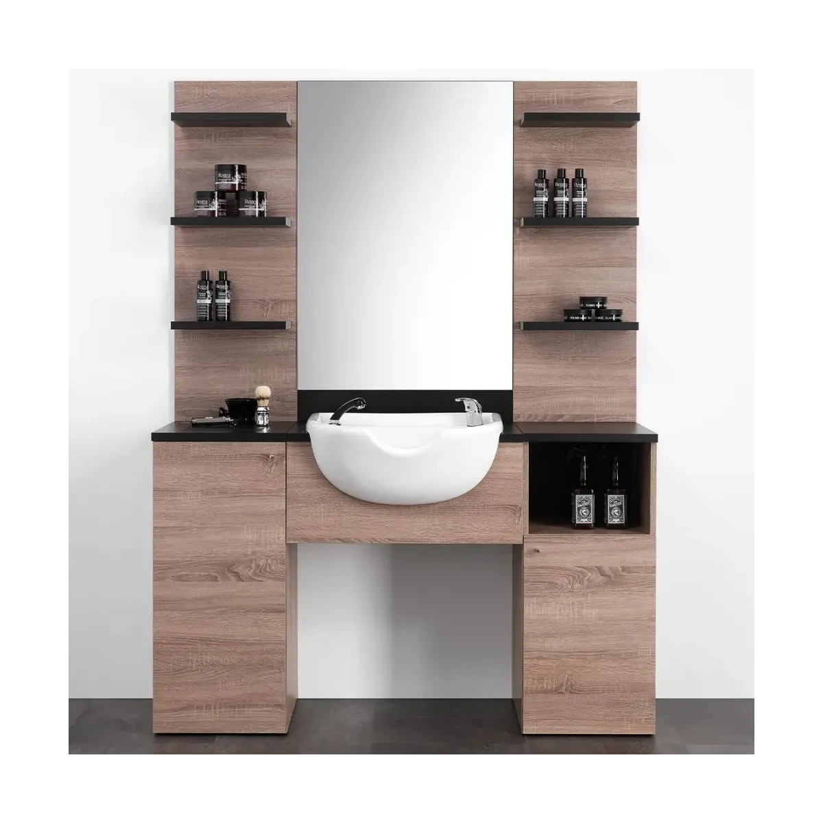 Postazione Barbiere realizzata con un'elegantissima composizione di mobili in legno. È perfetta per arredare un negozio barber shop risparmiando sui complementi visto che risulta una soluzione ideale e professionale, ottima anche per eseguire lo shampoo sfruttando l'inclinazione delle poltrone barbiere ed il lavello con doccetta e miscelatore. I mobili che compongono la postazione sono: