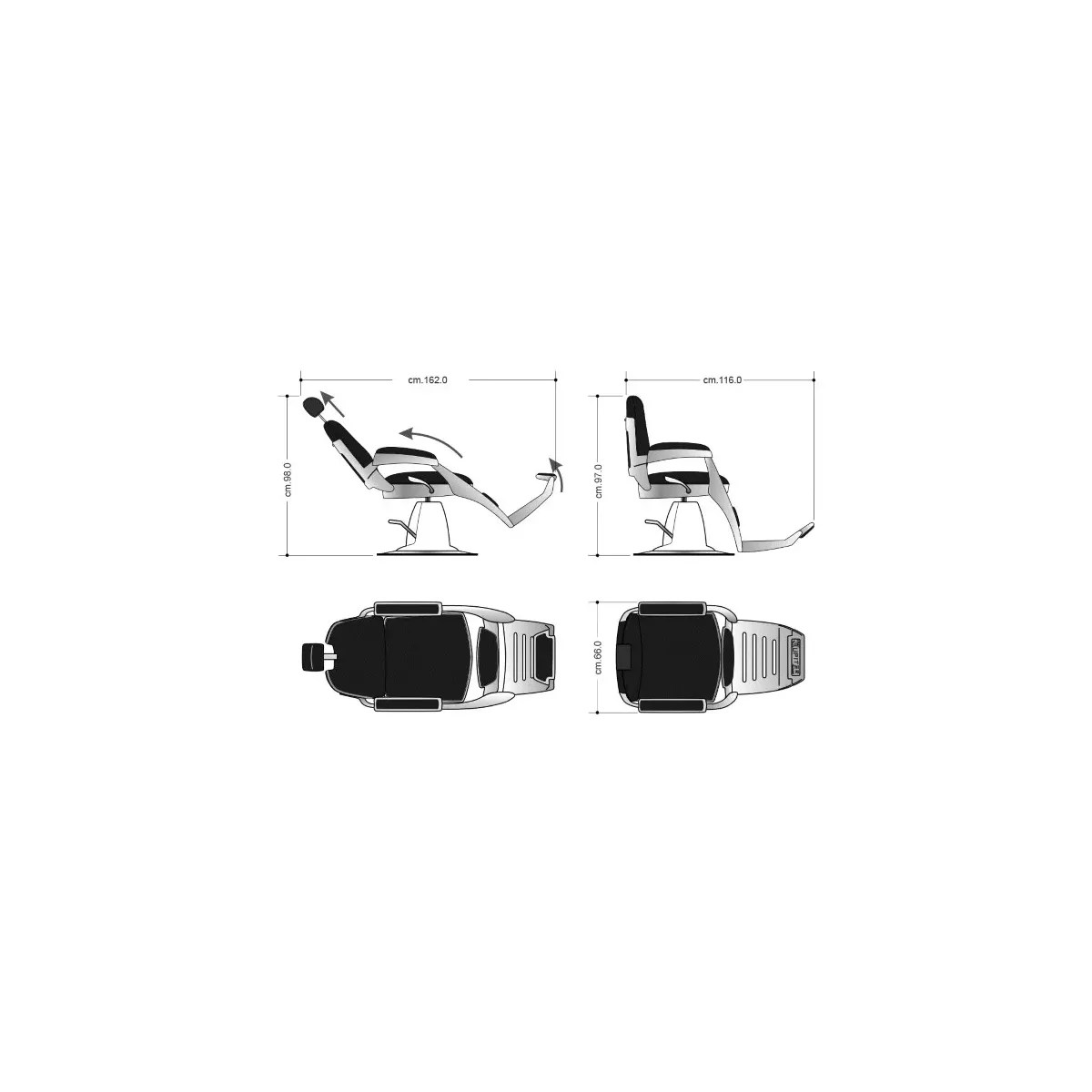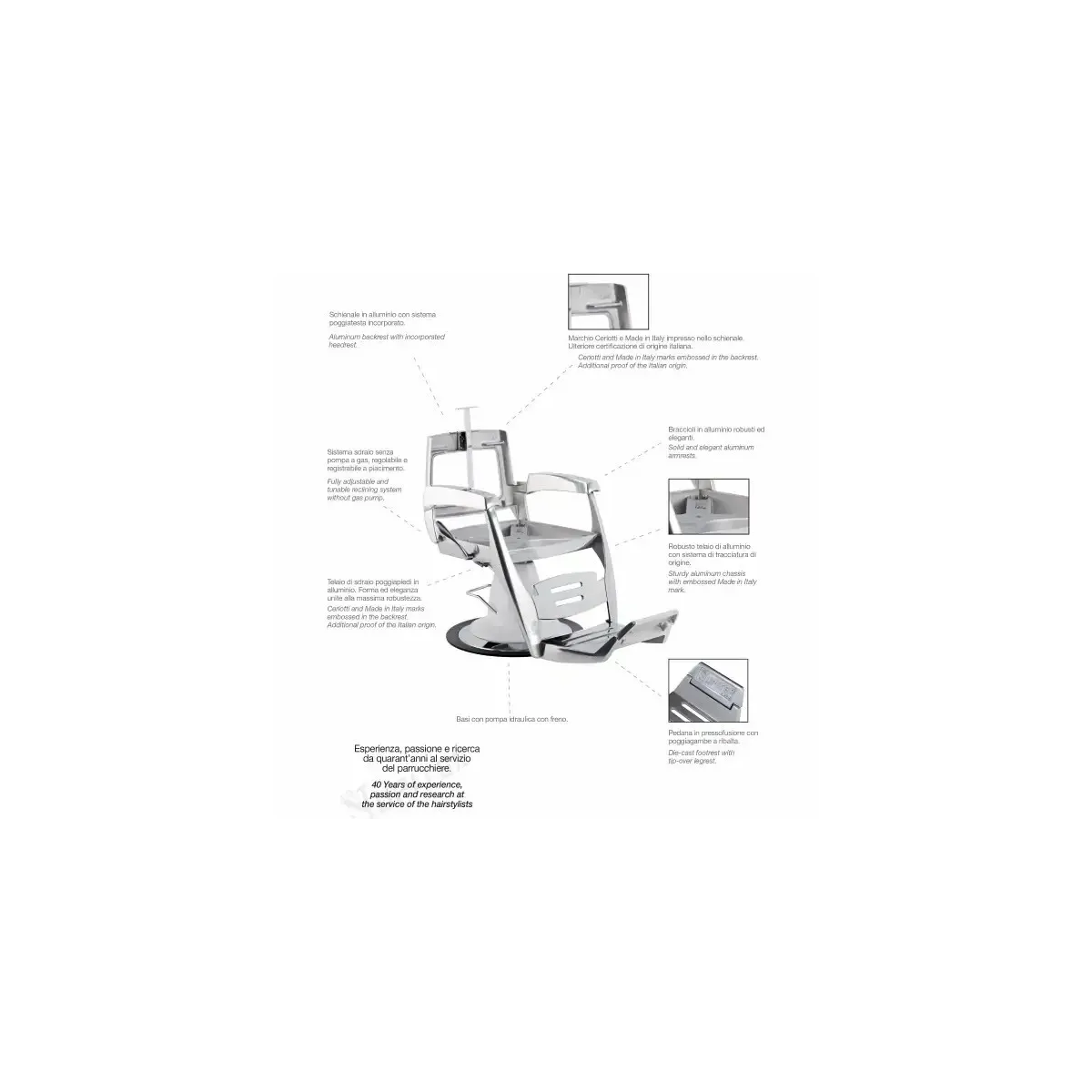 La struttura che sorregge la sedia barbiere è in alluminio e comprende una spaziosa pedana poggiapiedi con poggia gambe e ribalta capace di svolgere la funzione di alzagambe quando la poltrona viene reclinata.