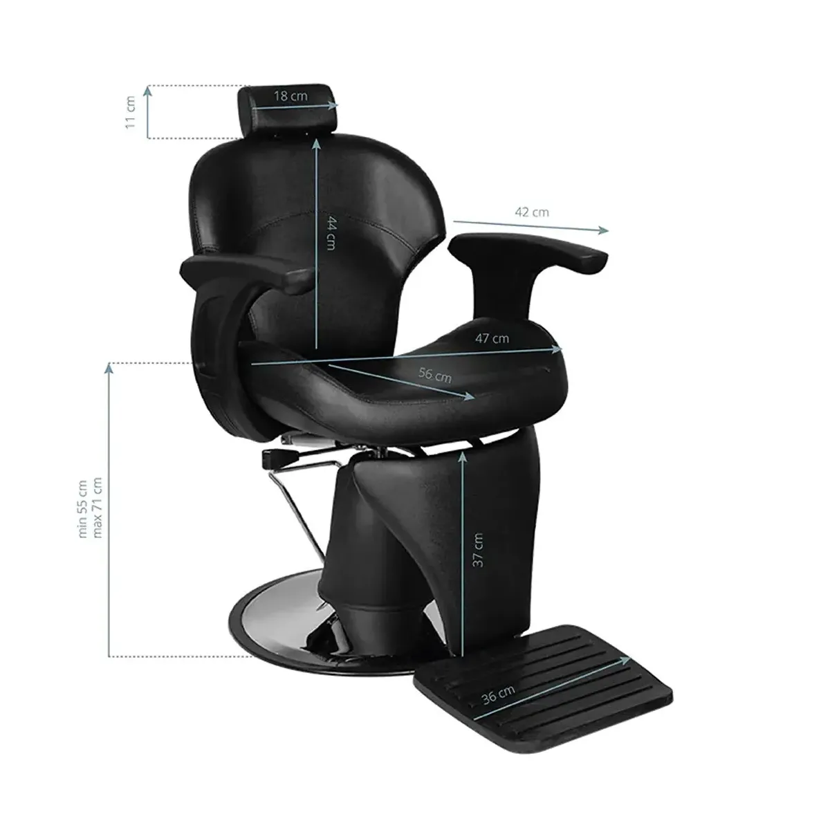 La poltrona da barbiere è dotata anche di una pompa per regolare l'altezza della seduta che risulta confortevole per il cliente anche grazie al poggiapiedi che consente di stare comodi sia in posizione retta che reclinata. Infine la base è girevole a 360°.