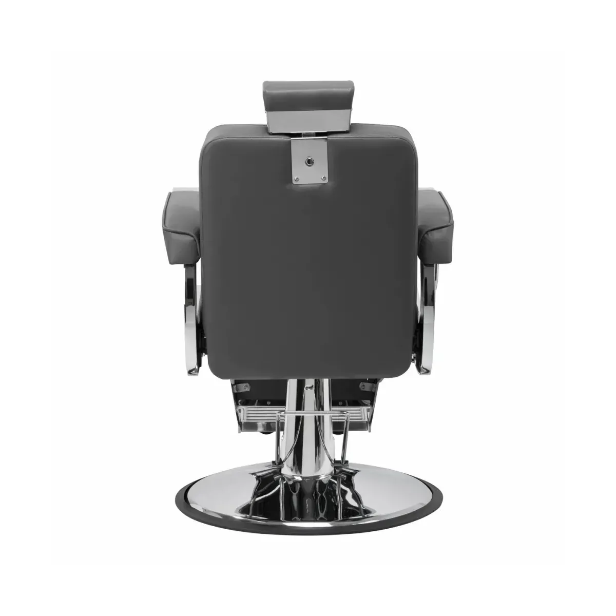 Base Tonda Girevole: La base tonda grigia, realizzata in materiale resistente, assicura stabilità e permette una rotazione completa della poltrona, facilitando il lavoro del barbiere.