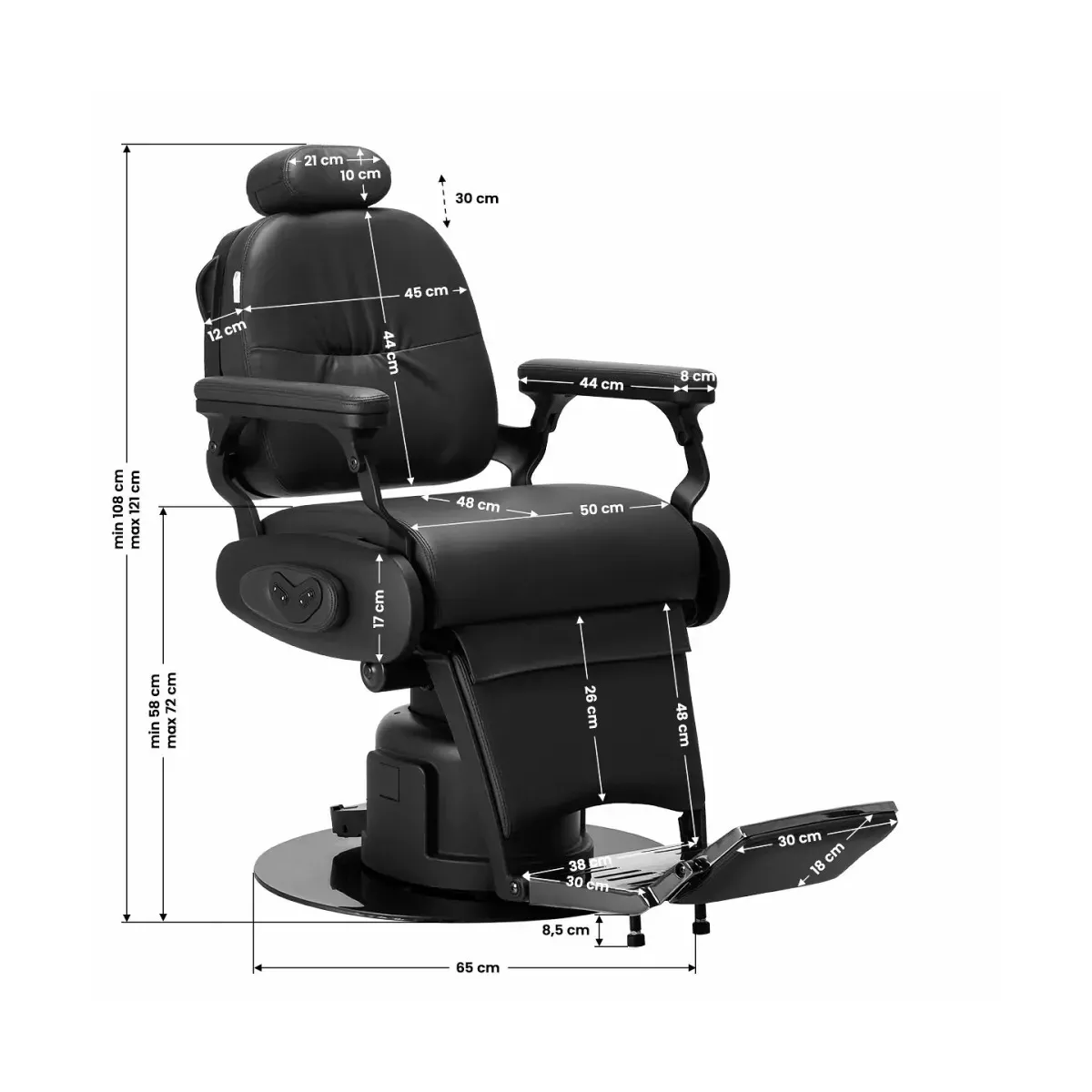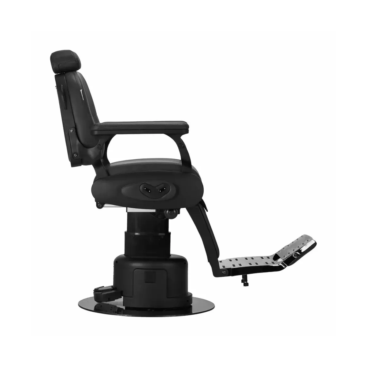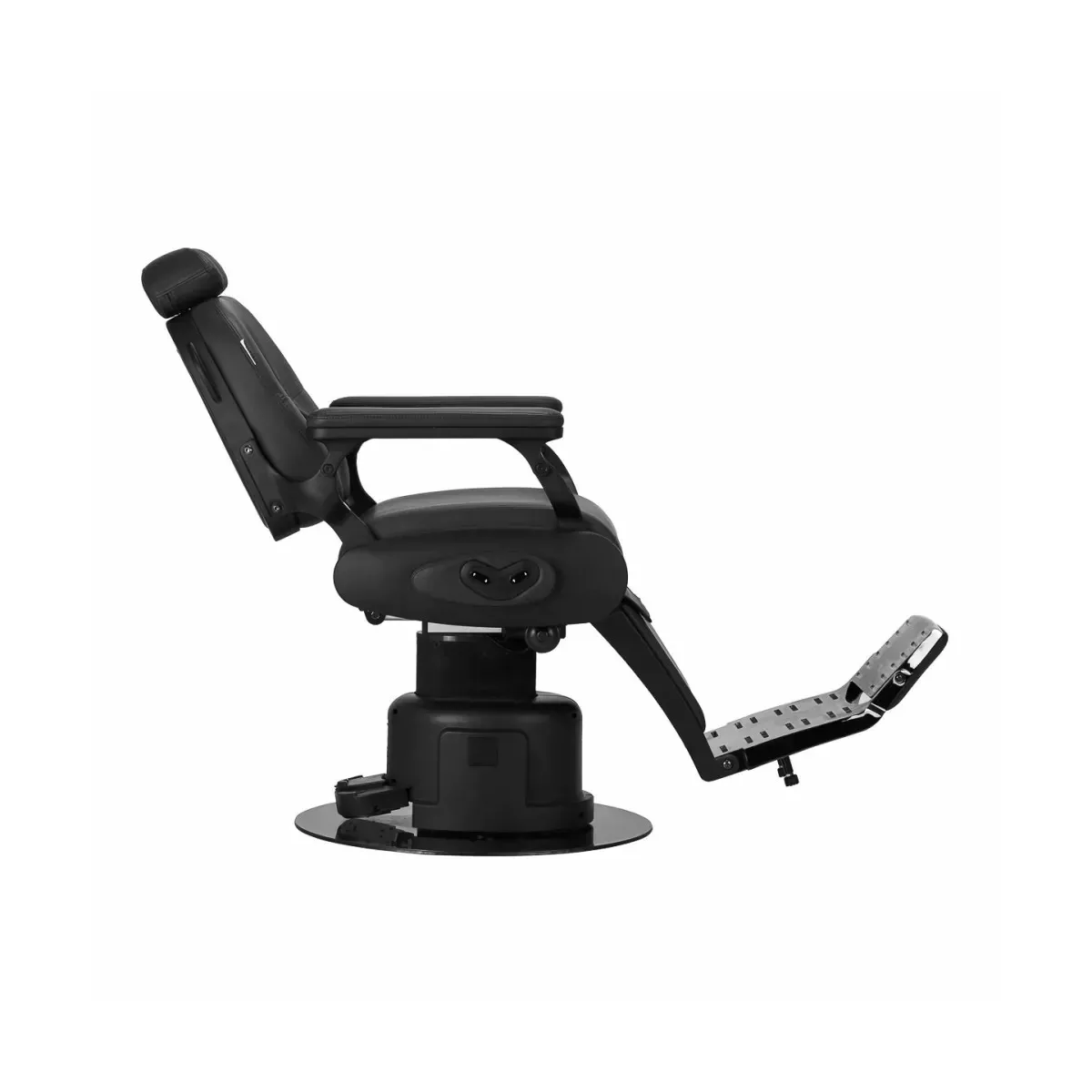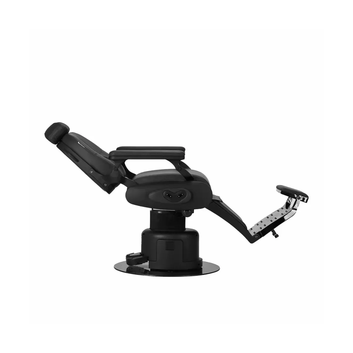 Regolazione Elettrica dell'Altezza: La pompa elettrica permette di regolare l'altezza della seduta in modo semplice e preciso tramite il tasco comandi laterale, offrendo un'esperienza personalizzata sia per il barbiere che per il cliente.