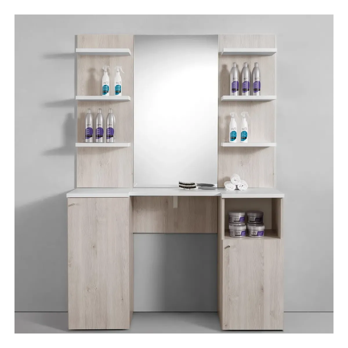 Design Moderno e Funzionale: Il mobile è progettato per ottimizzare lo spazio e fornire tutte le funzionalità necessarie per un ambiente di parrucchiere professionale.