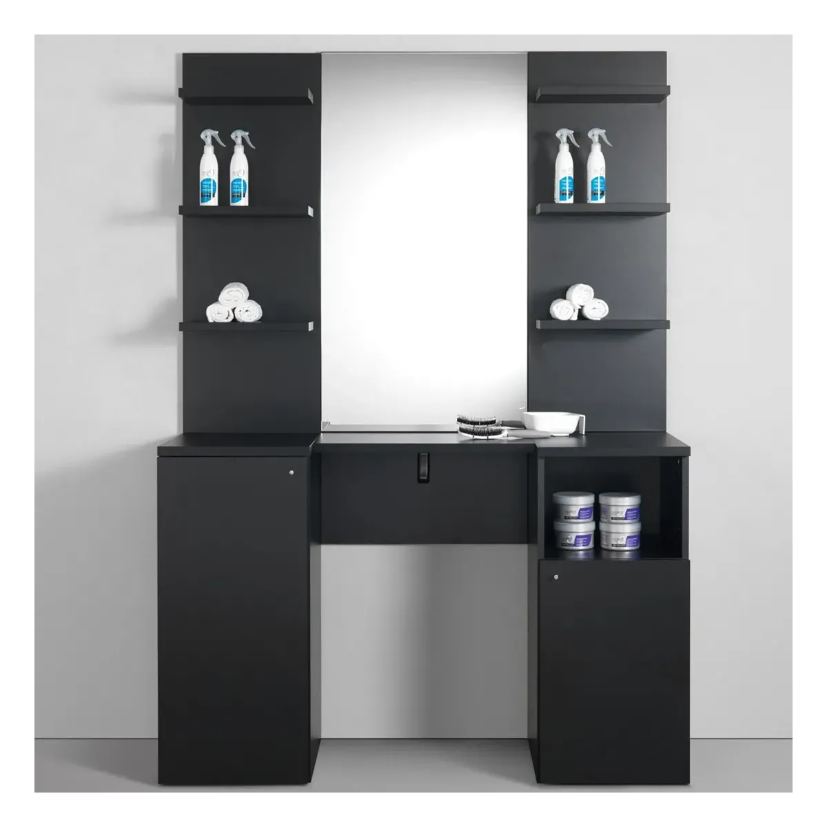 Piano di Lavoro: Un piano di lavoro si estende tra i vani laterali, offrendo spazio per appoggiare strumenti come asciugacapelli, spazzole e forbici.