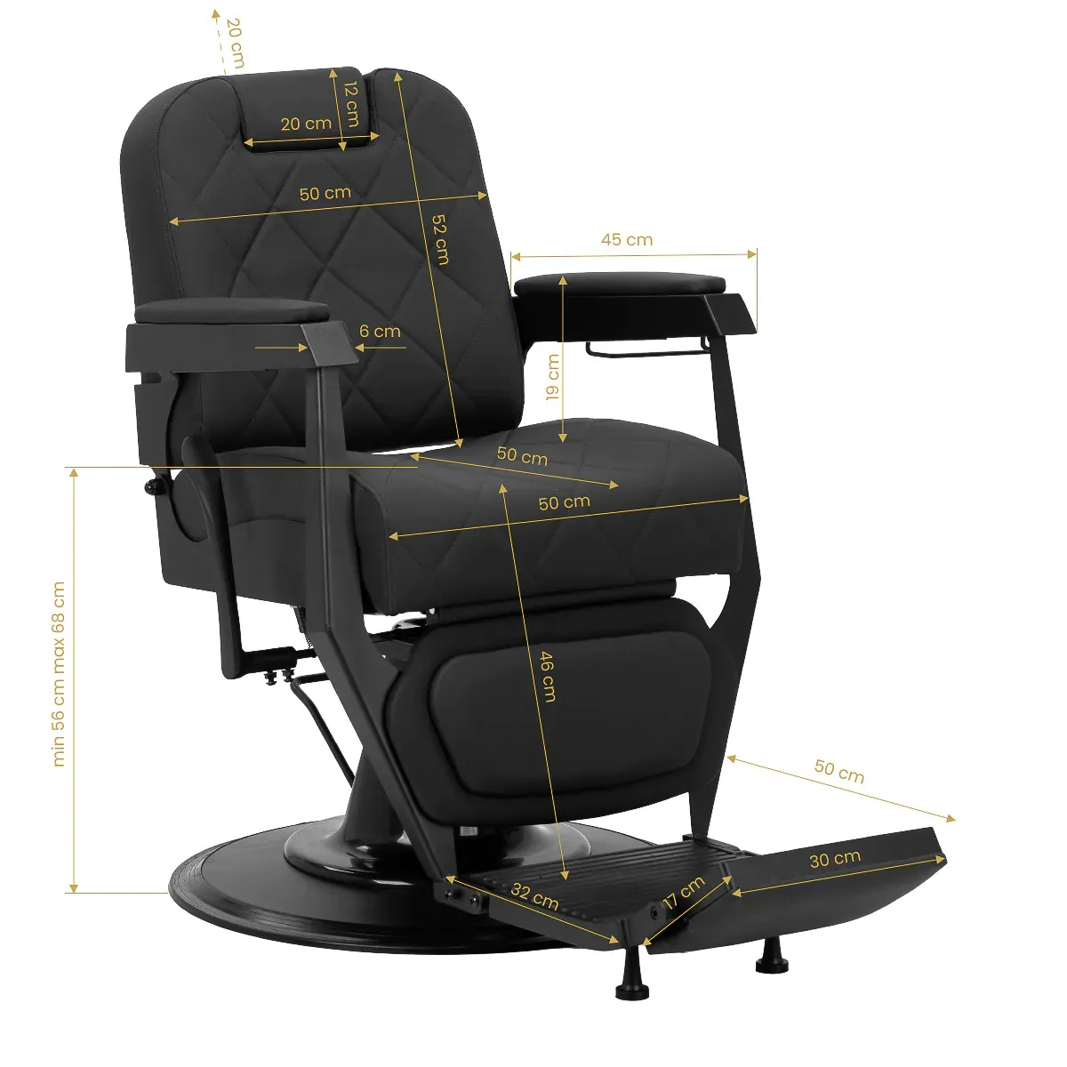L’ampia gamma di regolazioni consente di adattare la poltrona con precisione a servizi come taglio, rasatura e cura della barba, migliorando sensibilmente il comfort sia del cliente che del professionista. Il rivestimento nero opaco con cuciture decorative conferisce un tocco di eleganza e raffinatezza, rendendo la poltrona Bruno un elemento di design capace di valorizzare l’ambiente del salone.