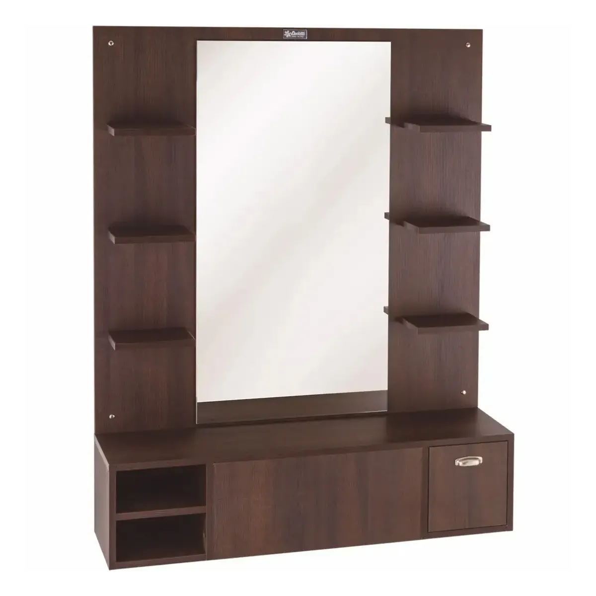 Mobile barbiere professionale Made in Italy completo di specchio grande murale e mensole laterali in legno con ripiani per l'esposizione dei prodotti di styling per capelli e rasatura barba. Mobile inferiore con ripiano d'appoggio, vani a giorno e cassetto estraibile.