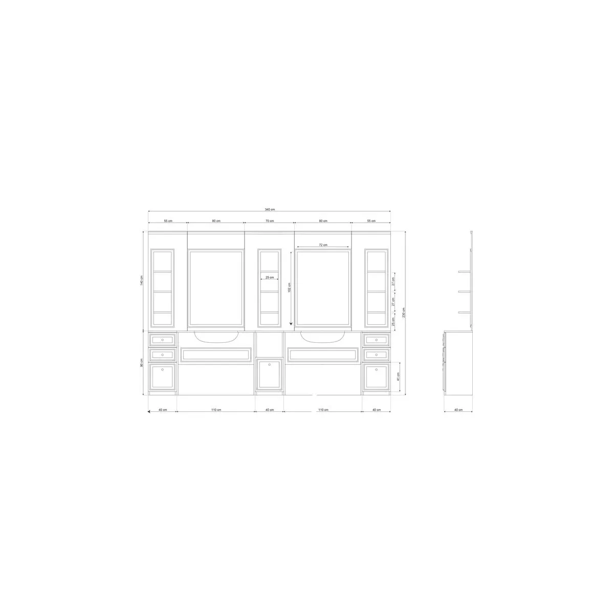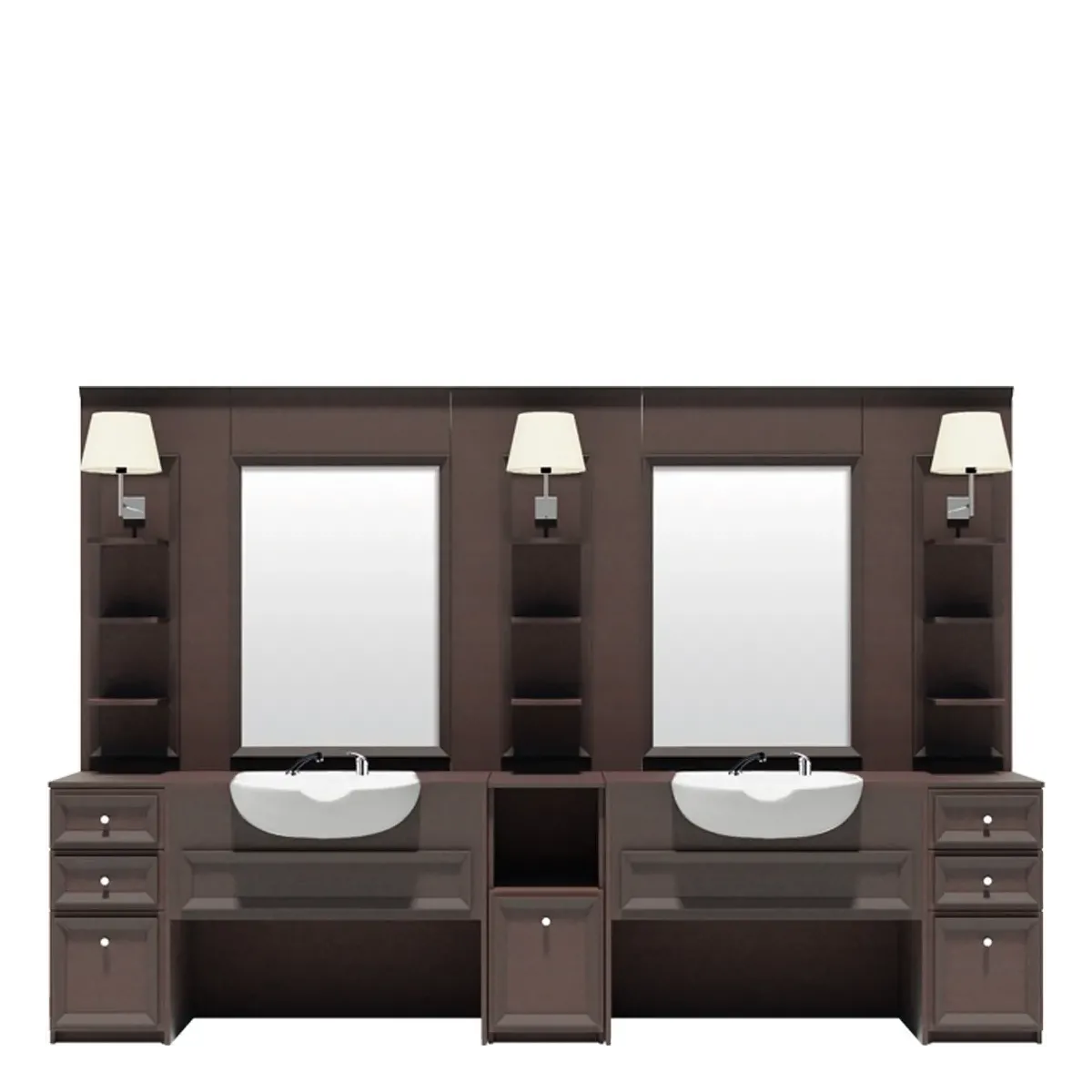 Mobile barbiere professionale Made in Italy con doppia postazione, completo di 2 specchi grandi murali, pannelli laterali in legno con ripiani per l'esposizione dei prodotti di styling per capelli e rasatura barba. Mobile inferiore con 2 lavandini in porcellana bianca completi di doccetta con miscelatore e piletta di scarico, 4 cassetti estraibili e 3 ante apribili frontalmente.