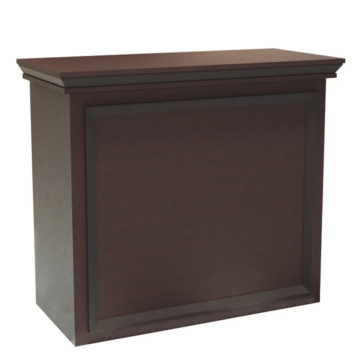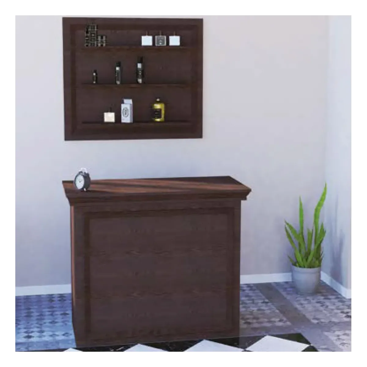 Banco reception da cassa in legno wengè, sul retro è provvisto di mensola e cassettiera, la cornice è verniciata a mano.