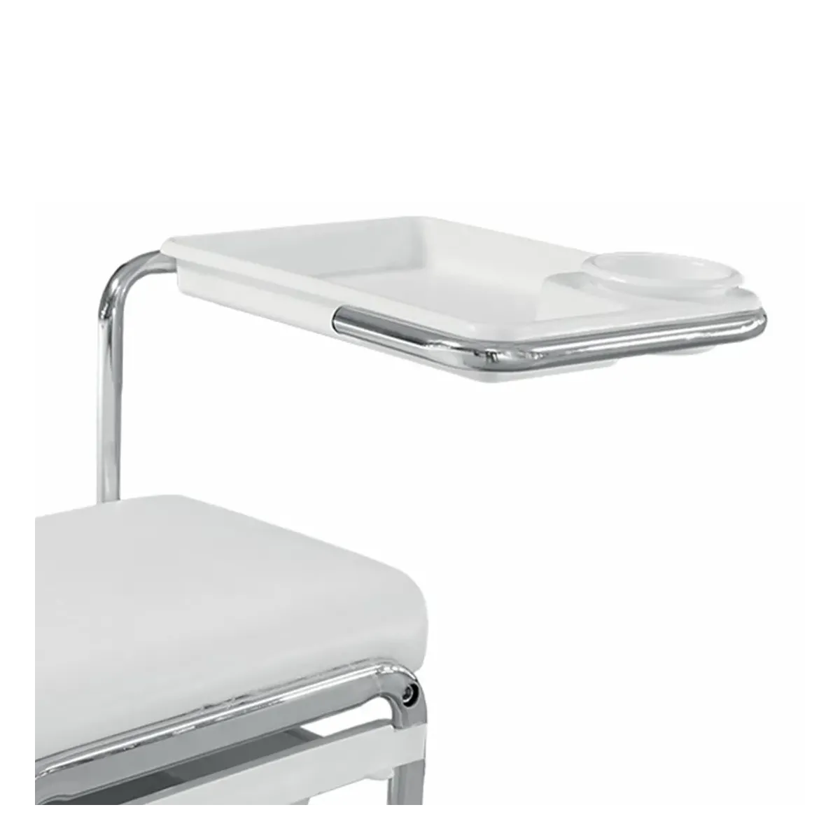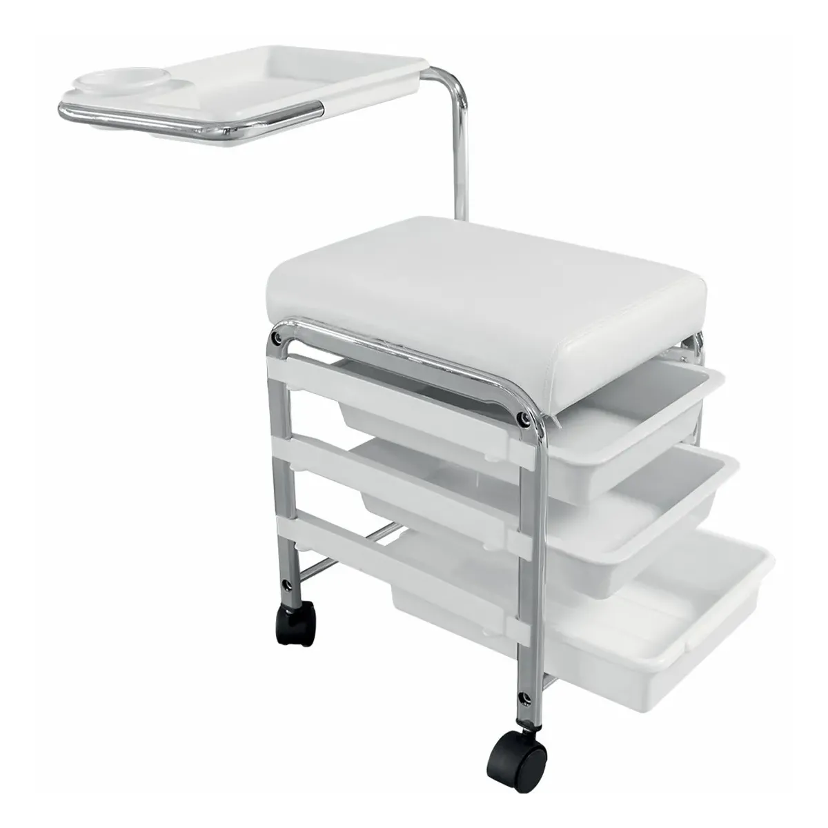 Carrello per Manicure Professionale per estetista, con struttura solida contenenti 3 cassetti portaoggetti ed una seduta in ecopelle dotata di braccio con vassoio porta oggetti. Possiede pratiche rotelle che ne permettono facili spostamenti.