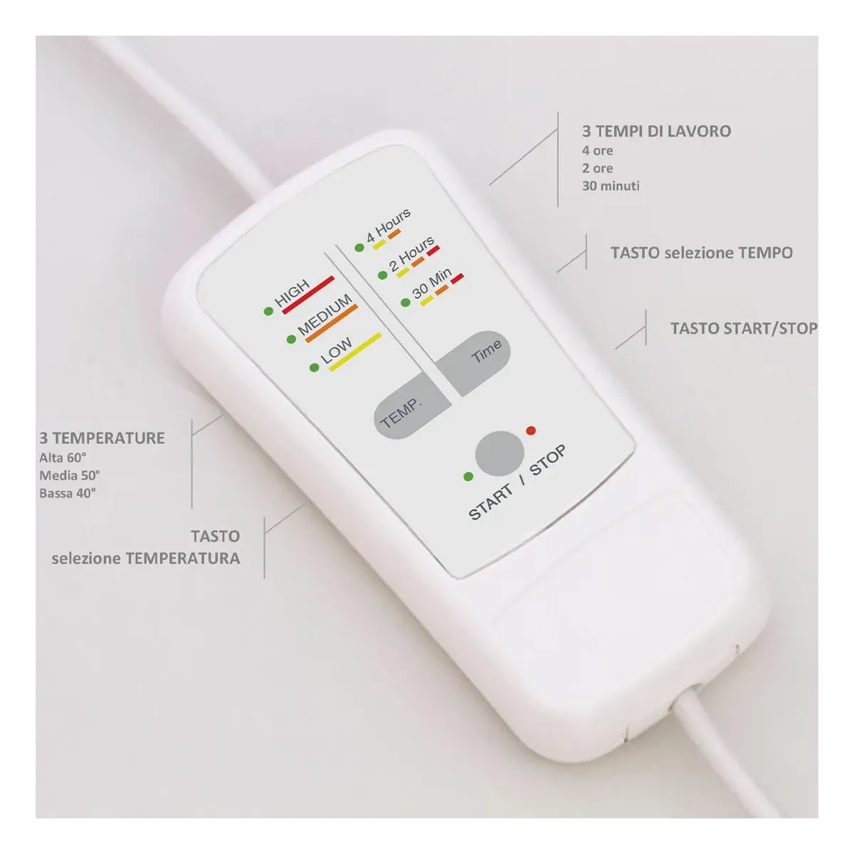 Questa coperta termica estetica è anche dotata di un commutatore elettronico (Made in Italy) chiamato Fast Controller, in grado di controllare la tempertatura, il tempo ed ha anche dei programmi preimpostati per 3 tempi di lavoro come puoi notare in foto. Inoltre questo dispositivo offre la possibilità di lavorare in completa sicurezza, soddisfacendo pienamente i requisiti richiesti delle normative in vigore. Tale dispositivo offre dei programmi di lavoro con un tempo non superiore alle 4 ore, al termine delle quali si spegne automaticamente, evitando quindi la possibilità di lasciare acceso l’elemento riscaldante per ore e ore garantendo così l'utilizzo in massima sicurezza.