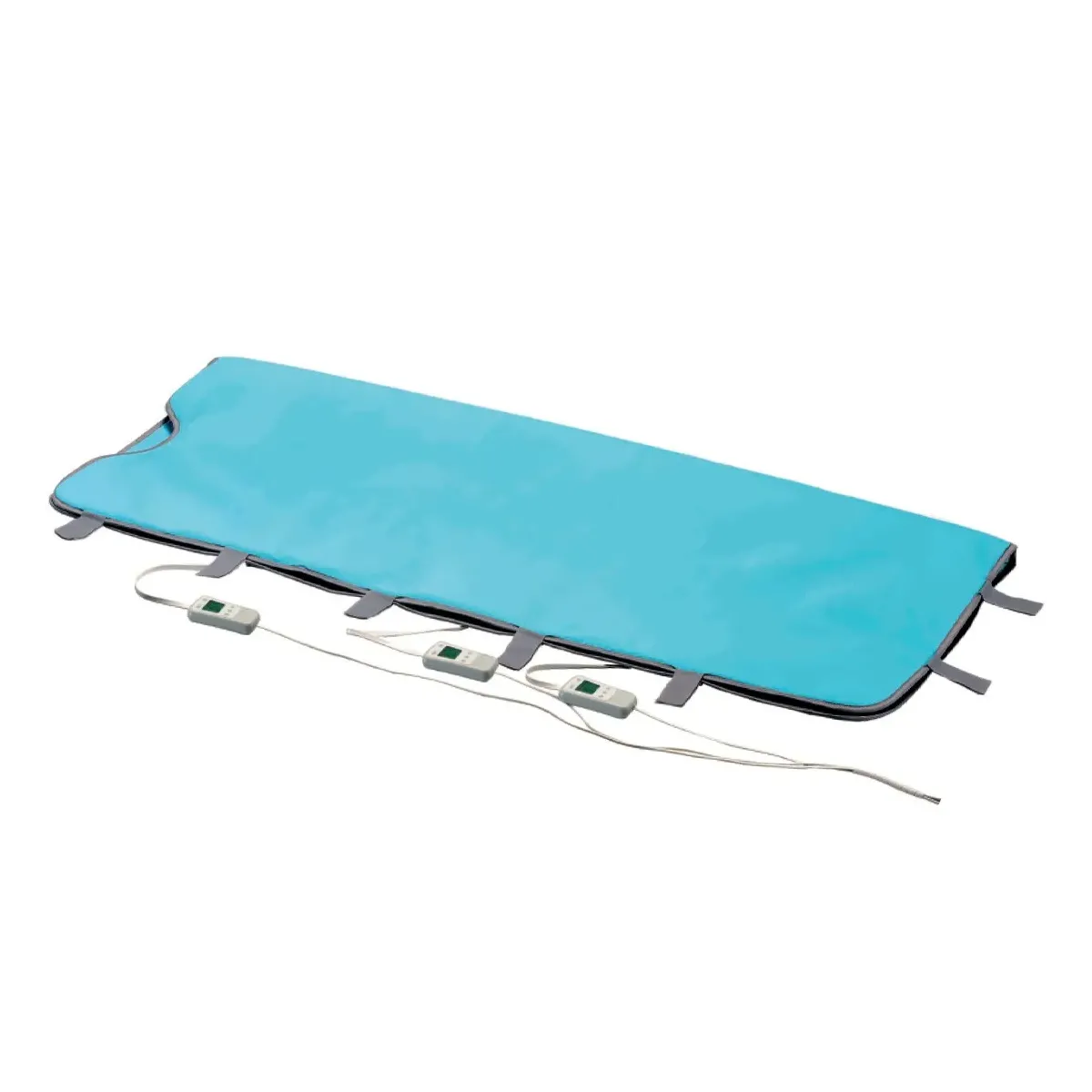 Coperta termica con 3 settori indipendenti, ideale per trattamenti sauna. Progettata in modo da avvolgere tutto il corpo esclusa la testa. Le 3 aree riscaldanti sono suddivise in: ADDOME - GLUTEI - GAMBE. Il cliente verrà avvolto nella termocoperta che poi verrà chiusa tramite la chiusura laterale a velcro.